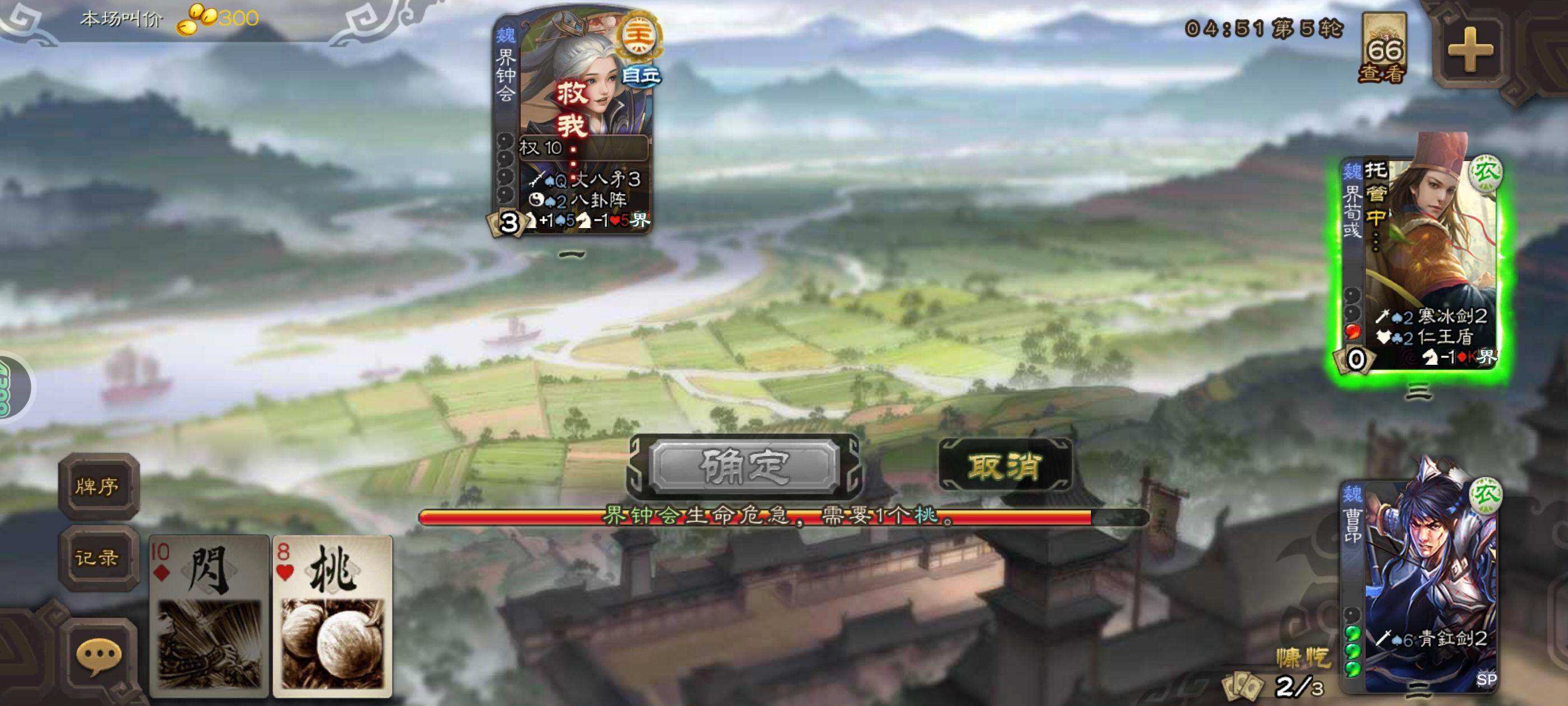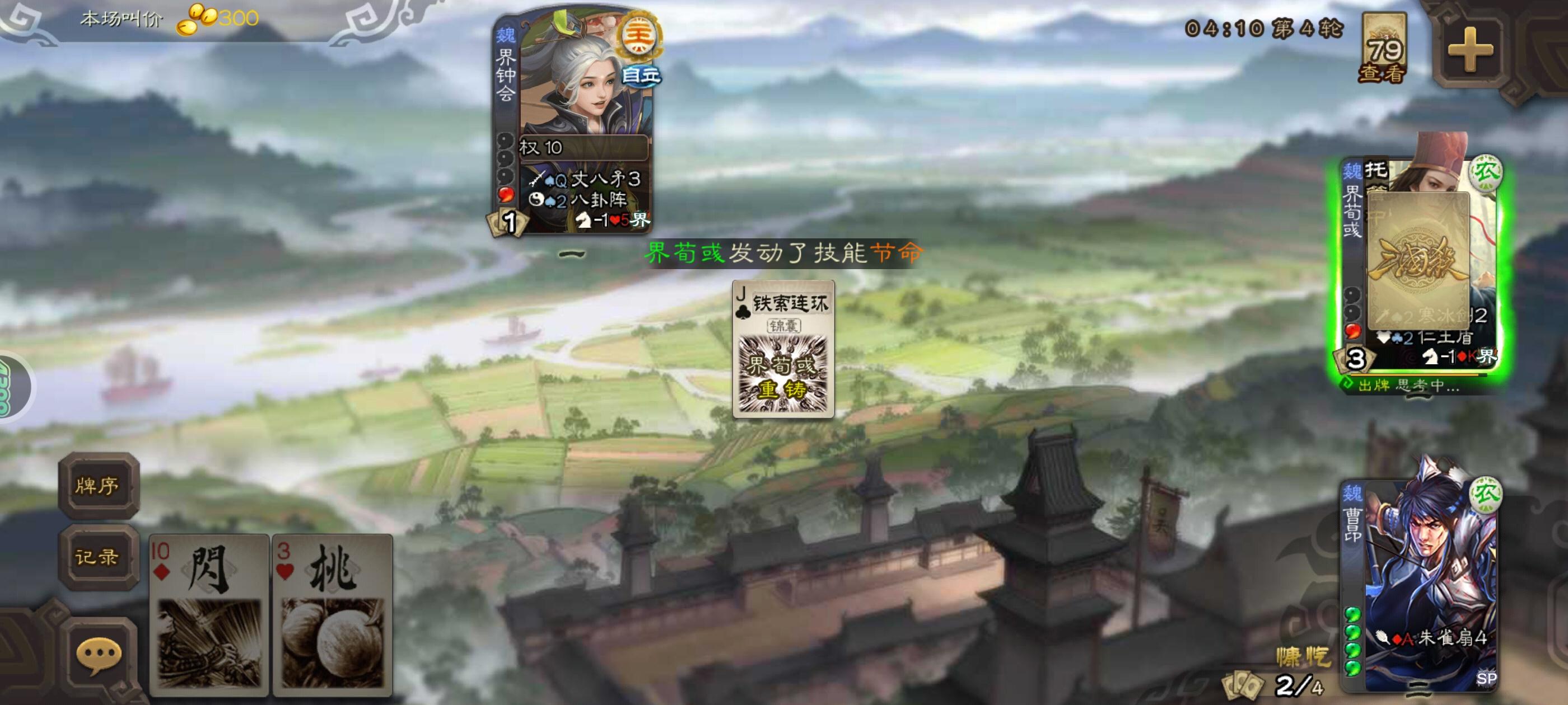 十一张牌你能秒我(bushi)。结果蔡文姬一摸给我连弩摸走了。还好黄月英小馋猫留了两个桃,没留闪,还拿桃去救别人,过到-1马一刀酒杀开始吟唱。老夫历朝三代…