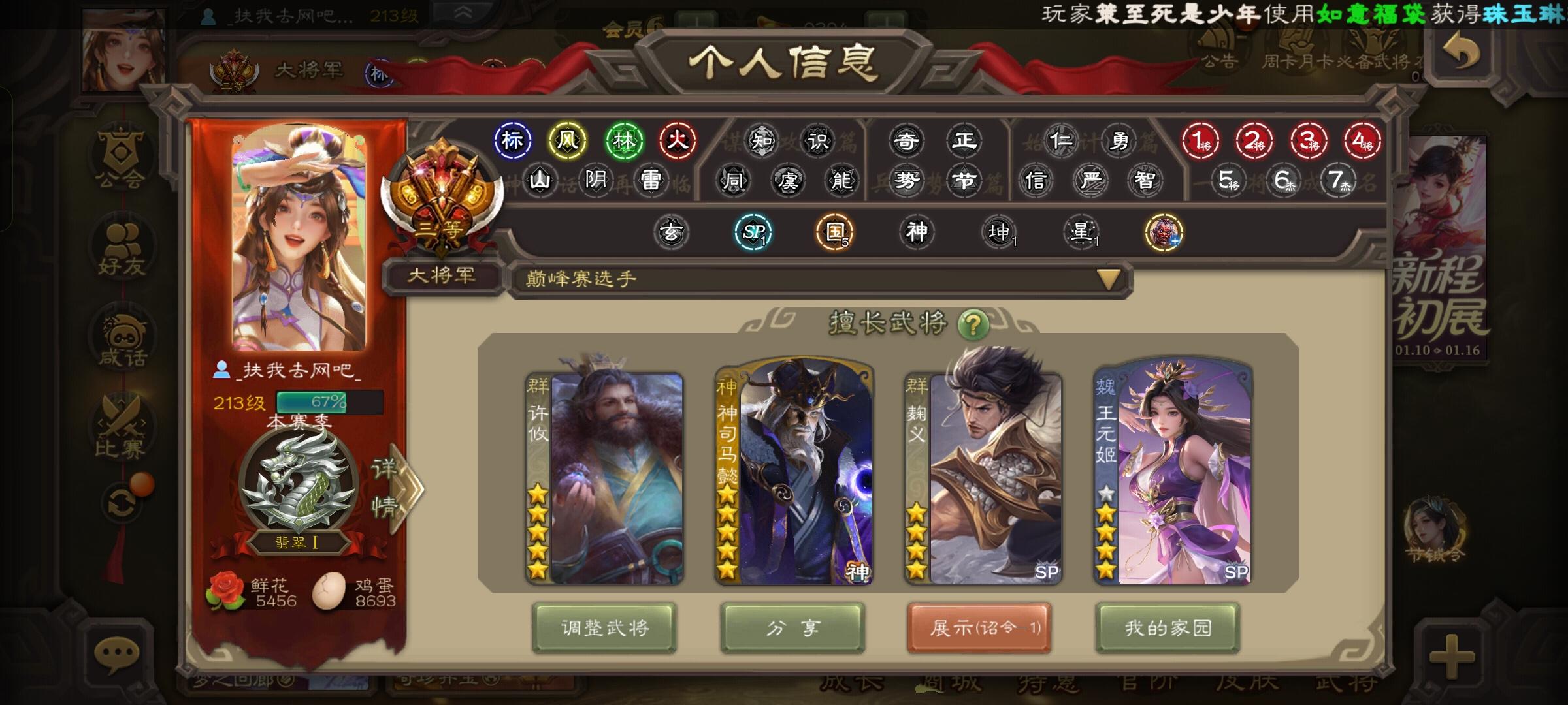 应该是个超级老号了吧,就当年充值解锁了元宝树后九年半以来纯零氪,这一次节钺令的辛宪英确实强,这才第二次充值上个298拿下加上充值送的一些搭子武将,将力刚好过大将军的线。纪念一下!