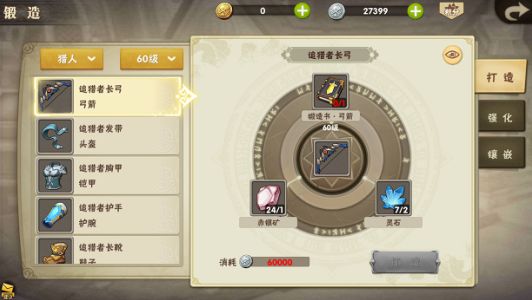 锻造系统 装备打造 每个人物可以为8个部位佩戴合适的装备,而装备则可以通过打造获得。 通过材料收集可以打造属于自己的装备。 每次打造的装备属性都是不一样的,具有浮动区间。 打造装备的时候有一定的几率产生装备特技,能为玩家带来极强的效果。 装备打造是百分百成功。 不同部位的附加属性及特殊效果也不尽相同,通过打造装备,玩家也可以有意识的追求某种属性的堆叠达成不同流派,如闪避流、肉盾流等。 强化装备