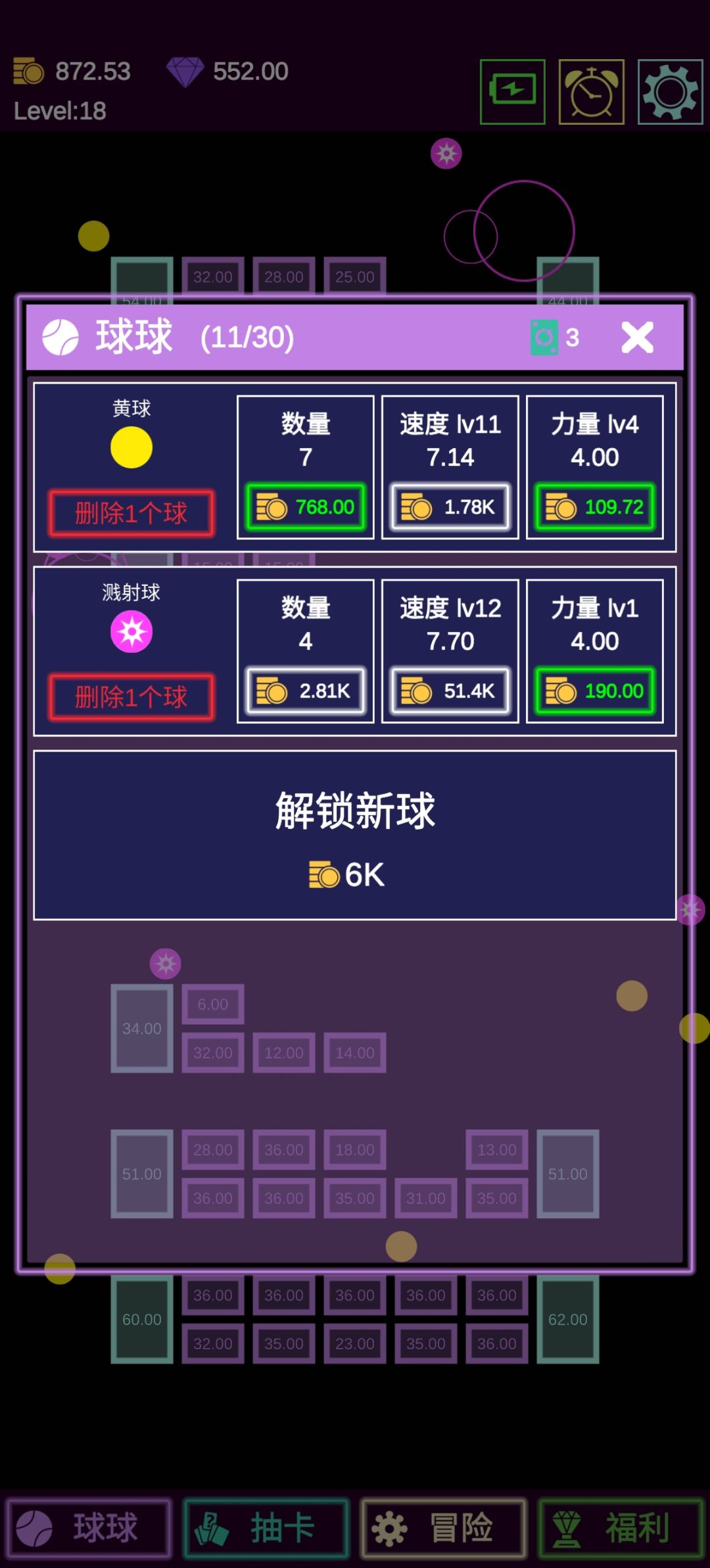 前期离解锁新球差距比较大的情况下,在保证力量接近砖块血量的情况下,所有资源尽量去升级小球速度,同时尽可能多的购买新球,后边解锁更多种类后可以适当删除一些前期球。
