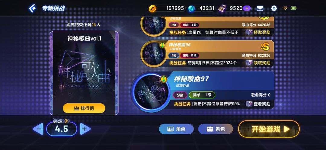 #节奏大师 歌名:无处可逃 难度:【5键】困难(7级) 歌名:不羁心旌 难度:【4键】困难(8级) 歌名:卡戎 难度:【6键】困难(6级)