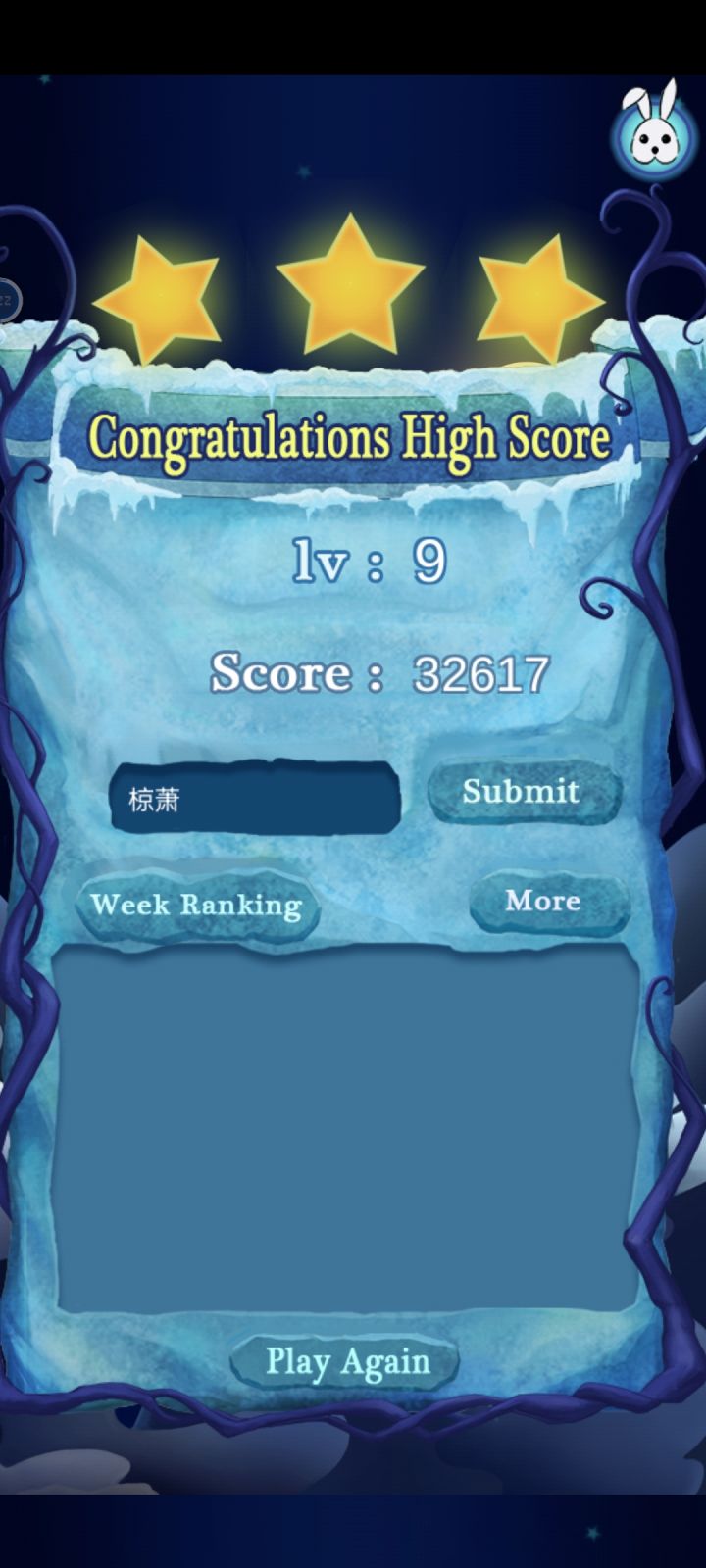 结算界面中间的level等级我一直觉得很奇怪有什么用,后来我发现好像是跳的越高等级越高,然而这功能和结算界面的星星数评定功能重复了,还是没什么用……然后就是结算界面的 more 按钮,我都不知道应该叫它按钮还是图片,so…你懂我意思吧?建议level改为每局可以累加经验升级来解锁新的兔子皮肤或者场景,建议合理分布障碍物的同屏数量,有时候是真的躲不过。很好玩啊,是个适合打发时间的小游戏,我记得我