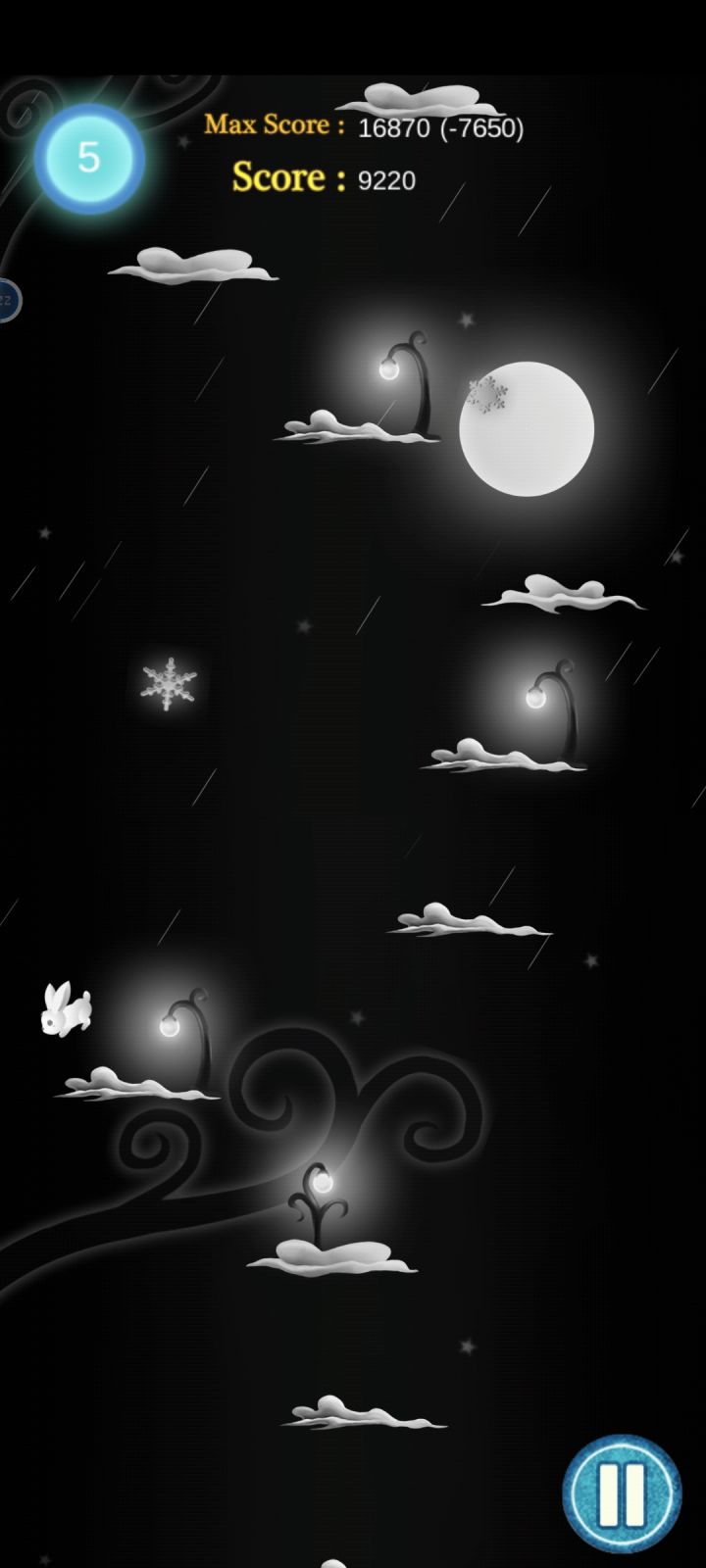 《星空跳跃》作为一款重力感应点触游戏,操作简单到没朋友。游戏仅需左右倾斜使小白兔移动,点击屏幕触发跳跃,控制小白兔不断踩着云层往上跳跃。恬静不失神秘的夜空,呆萌可爱的小白兔,甚至连云朵边角均细心描绘,小清新气息迎面扑来,你会爱上它的。背景音乐自然,小兔每一次跳跃、点亮树灯、踩到星星都会听到欢快的叮当声,手指忍不住一直按,铛铛铛响个不停。让你心灵愉悦。当然,奔月之路凶险重重,会遭遇从天而降的冰