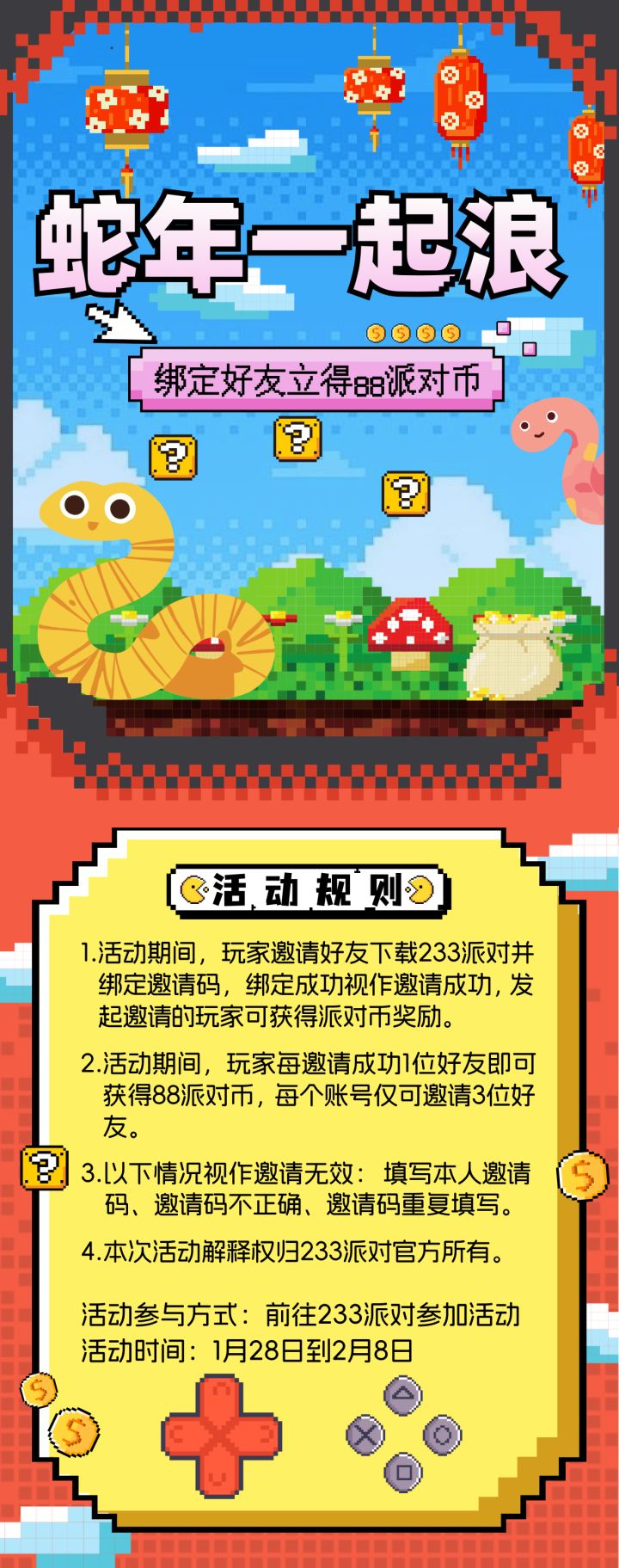 1月28日起,来233派对,参加【蛇年一起浪·绑定好友立得88派对币】活动即有机会赢得最高246派对币奖励哦#宝藏游戏安利派对 #福利活动