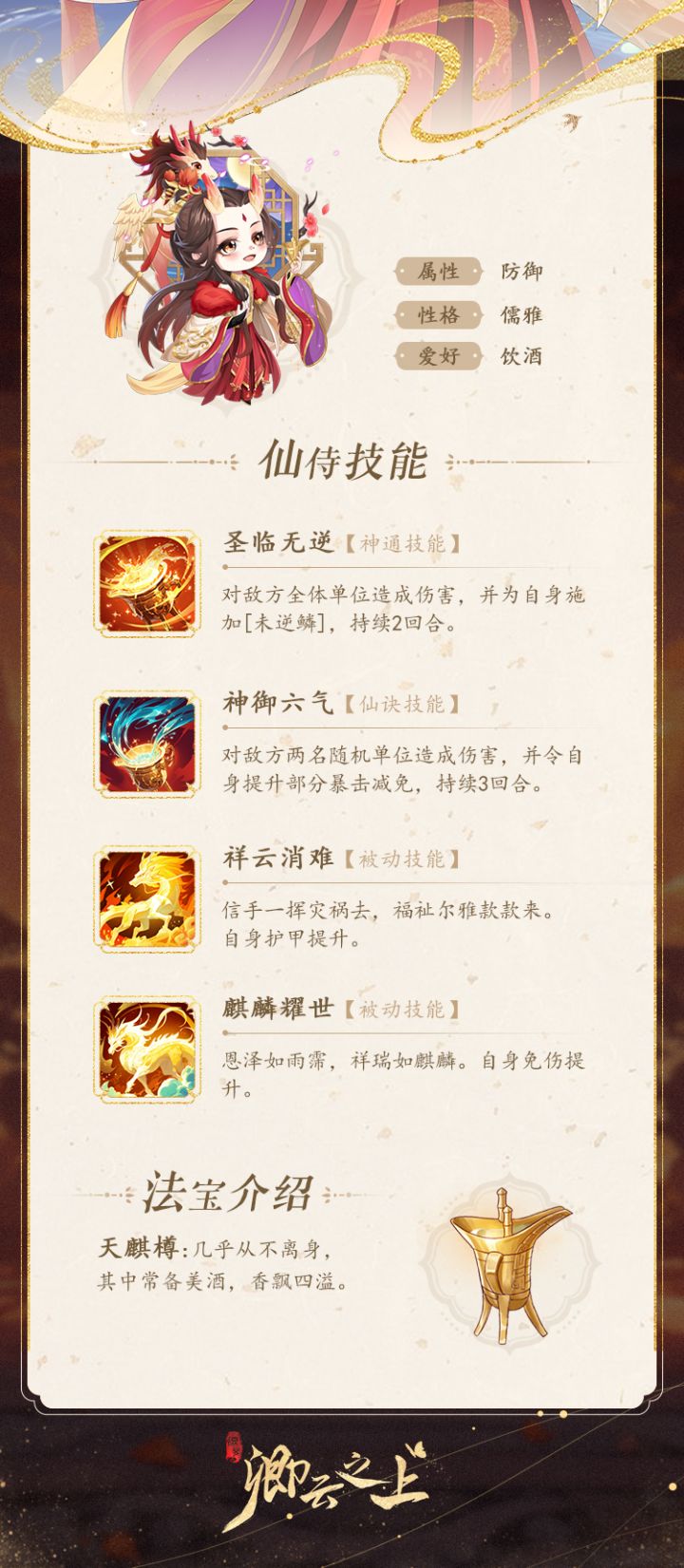 "都说麒麟能带来祥瑞,那我愿将所有祝福都给你。"仙侍:祝天麒资质:洪荒爱好:饮酒性格:儒雅#卿云之上 #发现好游戏 #游戏安利 #游戏推荐 #游戏日常