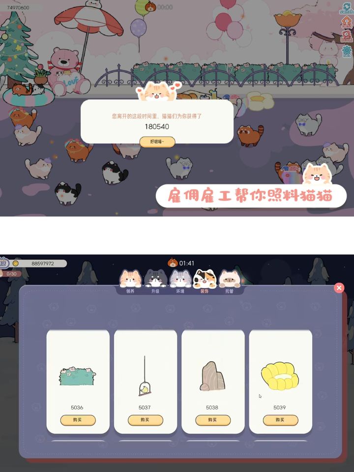 🎮游戏名🔺猫语拾光🎮游戏类型🔺模拟经营/休闲/治愈🎮游戏平台🔺steam/手机端🎮游戏状态🔺预约中(点击最下方游戏标签右侧“预约”,即可在游戏上线第一时间收到通知(●v●)📣)——🔅会在pc端和手机端上线的,休闲放置猫猫主题的游戏。🔅轻松护肝,挂机即可收获许多可可爱爱的猫猫。🔅布置猫猫们的生活环境,装扮它们的世界。——📣记得点击下方游戏标签右侧的“预约”喔,这样游戏上线第一时间
