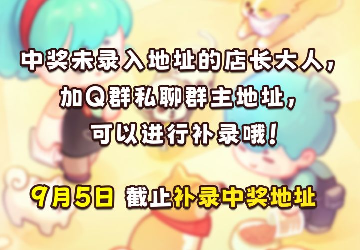 查阅了后台填写中奖的店长大人,发现还有13个地址没有填写,为了尽量让中奖的店长大人都尽数拿到自己的奖品,所以我们觉得再为大家延长一周的时间填写地址,截止时间为下周四。填写地址的方式为:加入Q群(二维码在P2哦),私聊群主;写明自己的用户id、收货姓名、电话、地址,并附上中奖截图方便我们核验哦!希望各位店长大人能感受到我们的心意!我们9月10号上午10点见啦~