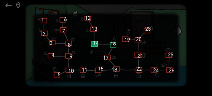 第一次做攻略可能有点乱,请谅解本游戏有个优点是提供了地图便于玩家快捷的改变场景收集线索,同时每个场景旁边的小标记也都为我们提供了线索(具体的在后文陈述),本攻略按场景给出各个谜题的线索与流程。上文地图我标注了数字方便我讲述也方便各位理解。1左桌子底下的摇杆后面在豌豆妹妹(9)和洋葱先生(16)那边开门会用到。2那个未开花的黄花需要在(3)中拿到肥料灌溉才能开花,花在(15)的花生先生那会用到
