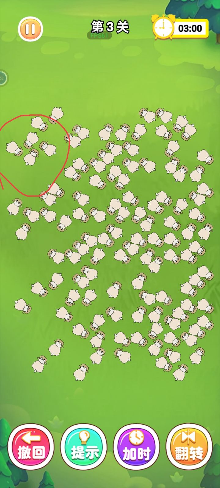 而且还需要注意的是羊还会顶,就是如果前面有点位置,点击羊,羊就会往前撞直到停下,这样让游戏变得复杂了,来个四边羊互围的话就无解啦。