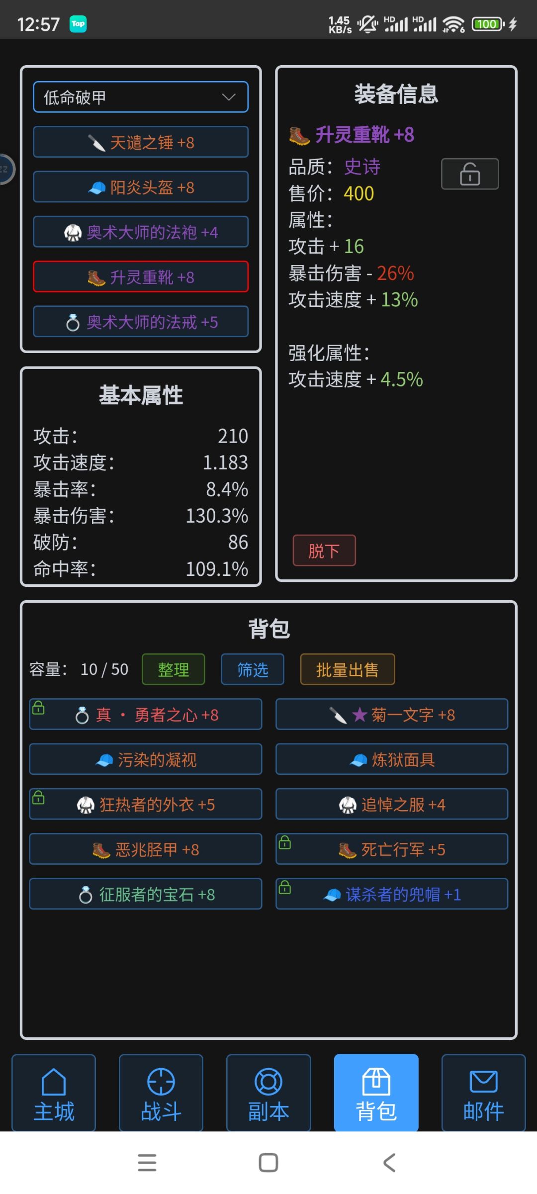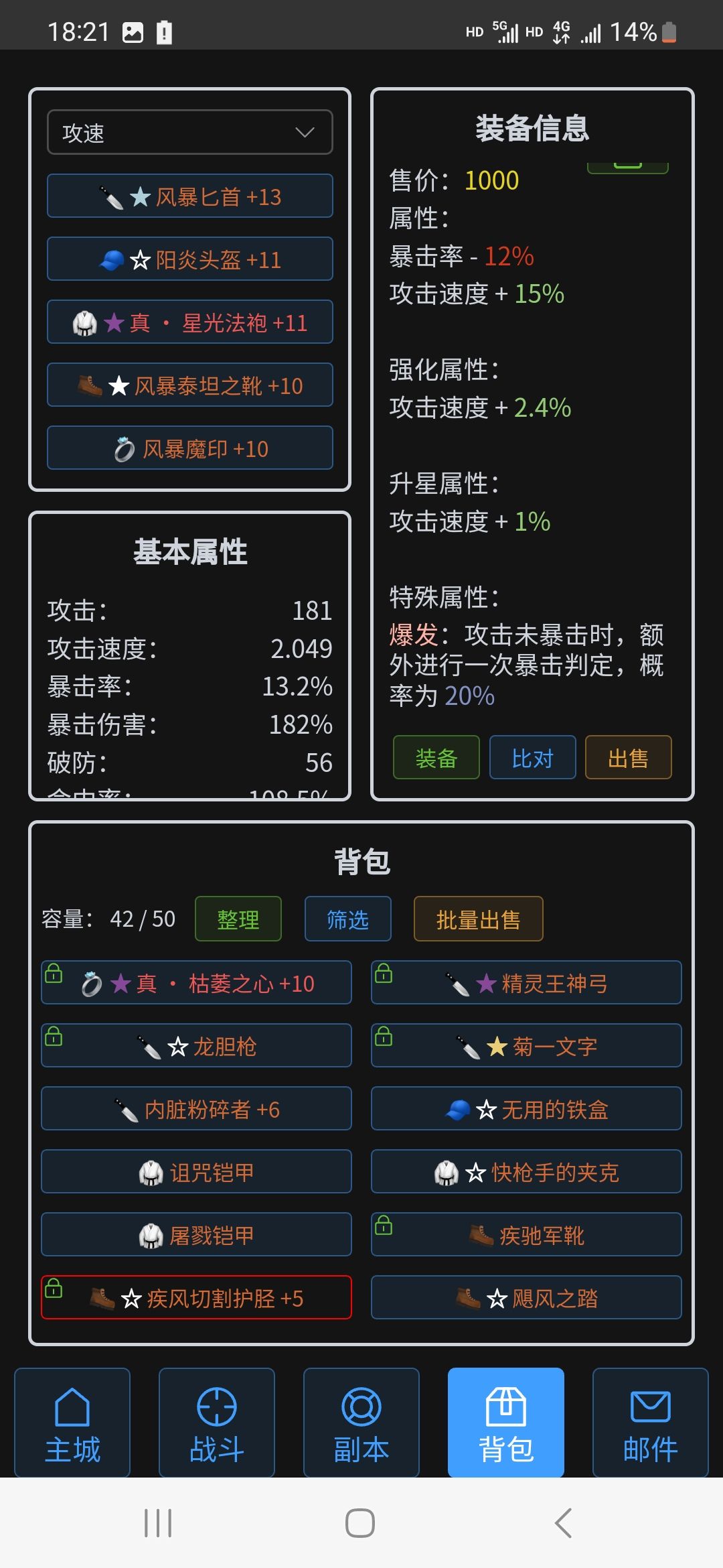 每天尽量提每日本层数,挂共斗攒装备,钻石全买金币,炒股攒金币。装备主养一套,副养一套。(⚠️以下两套装备仅是我个人推荐)(本部分提到所有橙色装备均考虑到未来发展性,可放心投入资源) 攻速套基础配置:风暴匕首 迅捷者两件套(绿装) 快枪手的夹克 风暴魔印 此时鞋子强化+8(攻速收益)的情况下攻速为2.568。优先强化鞋子和武器(攻击力)。 攻速阈值:1.71/2.01/2.51/3.34 进