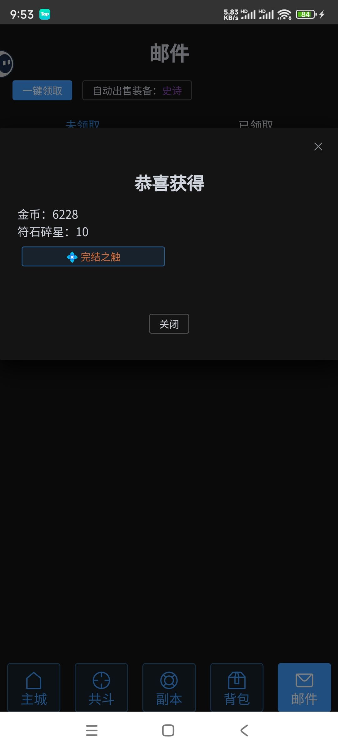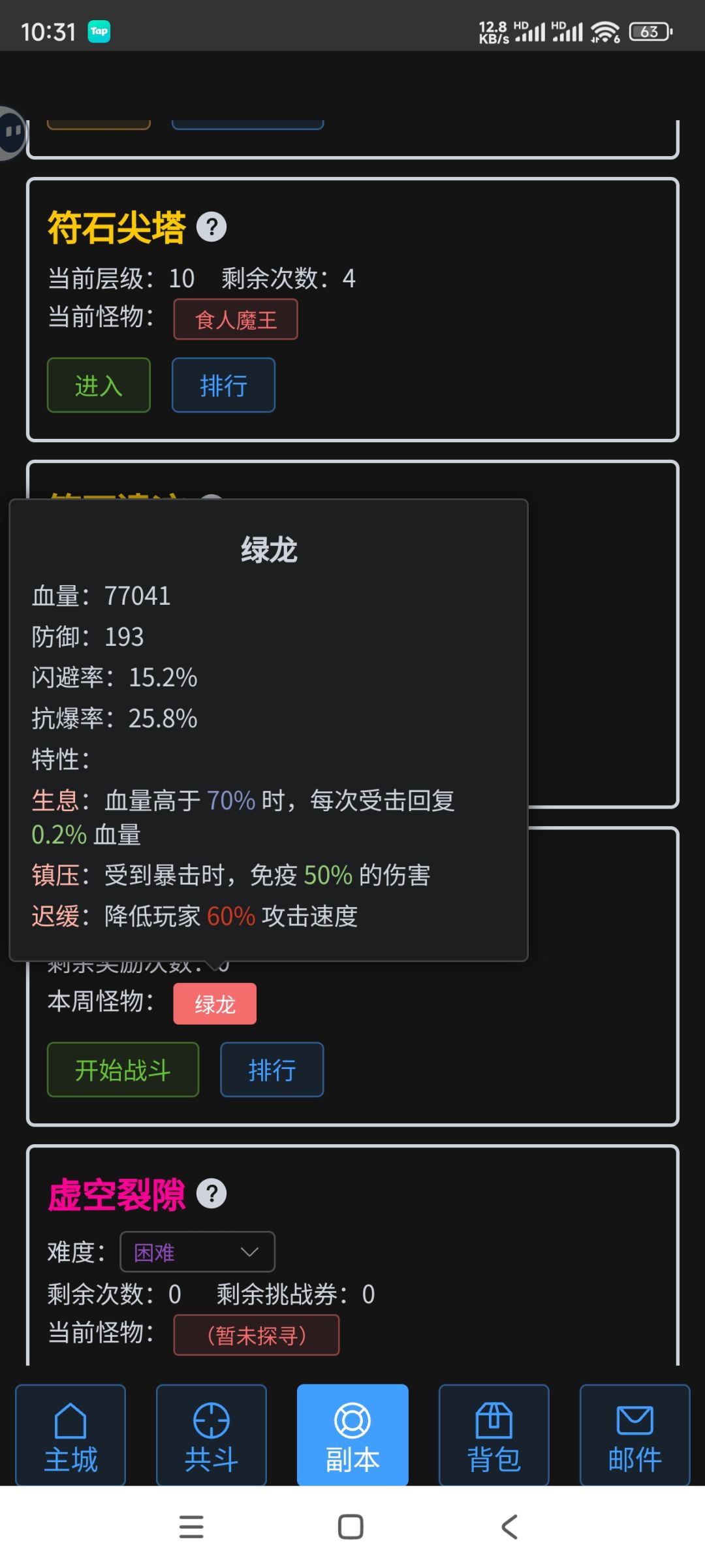 角色无等级 角色无技能 唯一影响伤害的就是装备 打怪: 1.“战斗”,主线就是世界boss,参加人数越多,自己输出越高,奖励越好。 点击“自动”,即可自动参战 点击怪物名字即可查看属性 2.“副本” 每日挑战每日刷新,失败不会扣次数 爬塔挑战为周本,每周刷新,可点击怪物名字查看属性。每次挑战只会打一层,失败扣一次次数,成功刷新次数为10 开局: 战斗界面点击自动参战 然后去副本打装备挑战,邮件位置