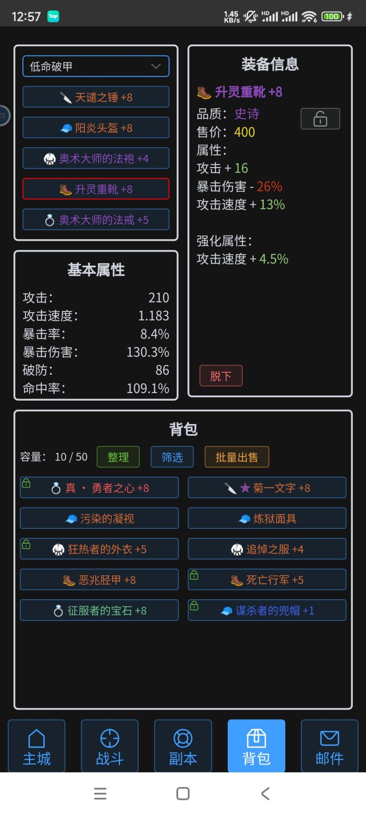 注:遇到高闪避怪,可以把戒指换宁静戒指如果遇到需要暴击克制的怪,试试方案2,或者强怼试试,还是不行的话,那就只能用备选方案巨熊那套暴击试试了~