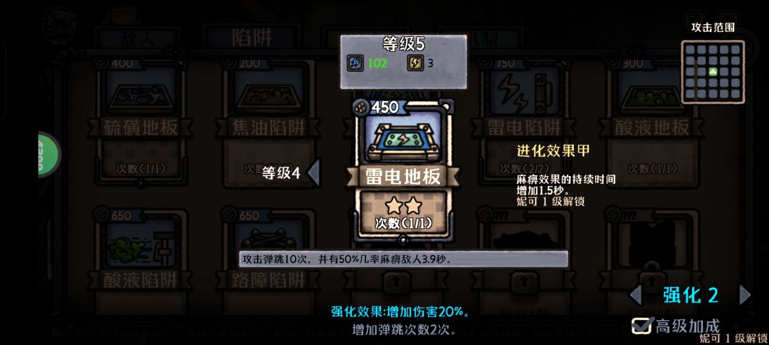 陷阱有(一个全地图攻击的陷阱,一个加攻速的发动机,两个加攻击地板。)核心是陷阱低于6(包括路障)使用次数翻倍(很重要的秘宝,有了就不卡手了,起手核心卡全在手上)。有攻击就拿攻击。 前期用酸雾喷射陷阱或者翻板过渡,推荐酸雾能防空,速度升2星之后删卡,找另外两个配件,挑战全拉满很容易升级删卡。 有2星之后看看商店多不多,优先走删卡,删好了就走商店,没有要的秘宝就把钱存着。(好的秘宝是重选点数加材料数,