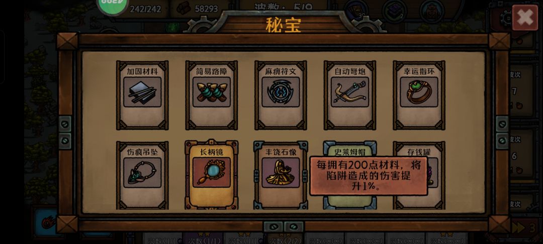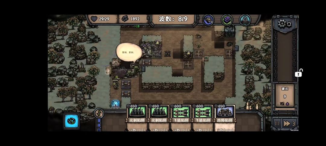 🎮玩法 单机塔防类游戏,手游版本内容略少,完整本体在Steam上,有兴趣的话可以过去看看。 核心战斗比较突出塔防的策略性,战前可以清晰看到敌人的行走路线,使用路障可以改变其行走线路,但是不能完全堵死,否则会触发其直线突破。机关陷阱卡牌非常多,有点像2D版兽人必须死,墙上的和地上的都有,还有人形兵种。 关卡内使用陷阱需要消耗木材资源,对此资源需要统筹。因手牌从牌库里抽取有一定随机性,不一定会是很合适