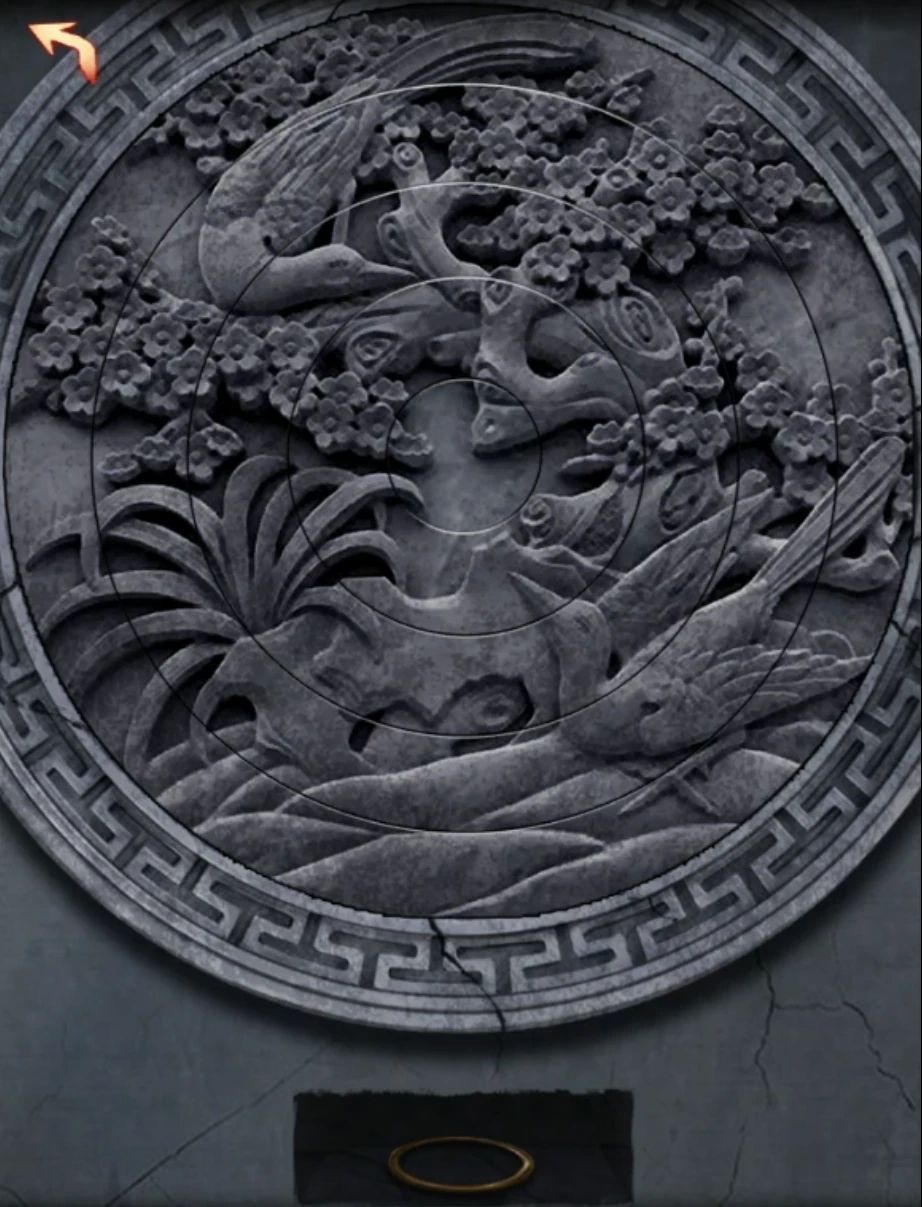 最后一章啦,首先注意一下门口对联,对联带数字或者颜色的大多数都是后面的线索,所以重点是绿永结同心,红喜成连理,查看一下左右的两张壁画,很简单的无联动旋转拼图,从中间往外转即可,左边是鸳鸯戏水图,右边是喜鹊连枝图,拼好后拿到两个圆环。 然后查看一下左右两个门当,一个是有图案的,另一个是文字,文字内容结合图片来看的话就很好推理了,其实就是个数字九宫格,确定的位置是中间的一列竖向951,还有左3右7,上