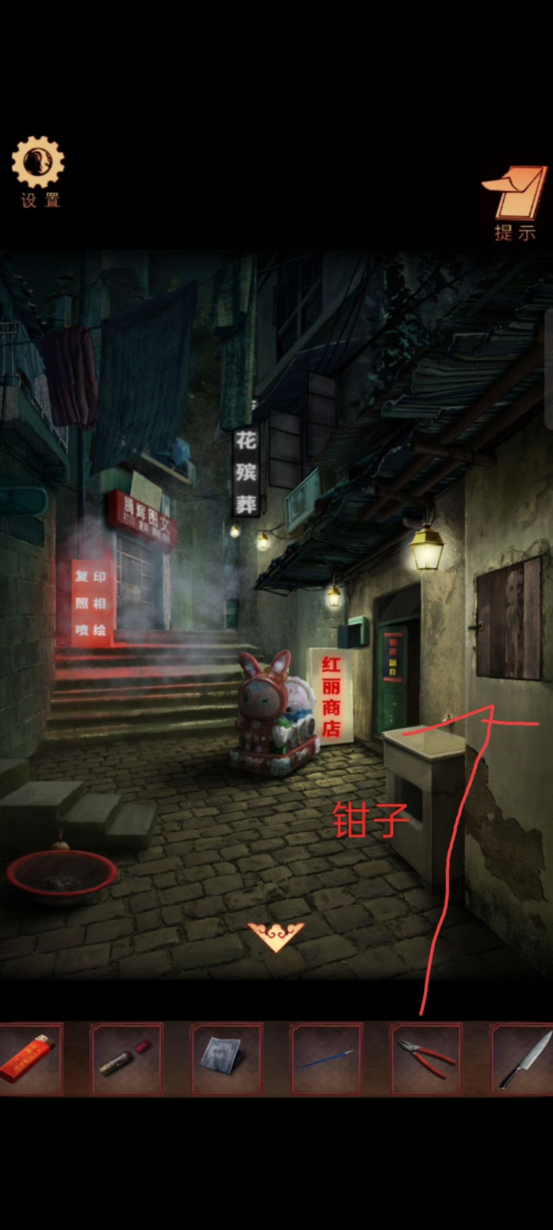 完成四个鬼的供奉后选择能不能出去,发现还是出不去。 然后手机拍照 之后会多出一个鬼,他要玩碰碰车。进去店里把所有钱放进去。 这个小游戏要是不会就跳过有点麻烦。最后获得硬币。 然后用钳子打开抽屉获得插线板和铜阀门。 然后插上插线板投币之后获得磁铁 然后回到面馆,面馆下水道有钥匙,用磁铁吸 到黄姐店里获得冥纸,然后用打火机点燃,最后用汤碗。 给水龙头安上阀门,接水,获得纸灰水。 用之前得到钥匙打开打印