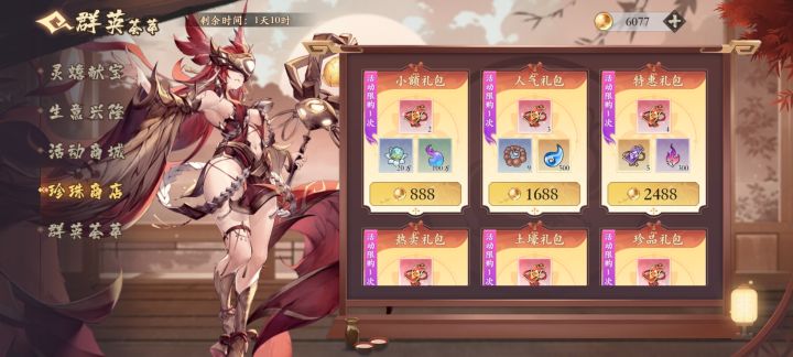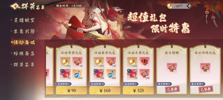 因为我们区九曜刚轮过去,所以先聊一下红劵活动 首先,红劵和九曜是唯二可以囤的活动资源,然后这两个活动都是3天的,所以不是很值得花珍珠买《图四》的礼包,在资源不是很缺的情况下。 《图一》是灵石的购买,在这个活动期间买满就行,一共拿8张劵 《图二》是在商店里消费,挑便宜或者要用的买就行,也是一个8张劵 《图三》是每天礼包,一个是上线领一张劵,一个是300珍珠一张劵,3天一共6张劵 。 算上平