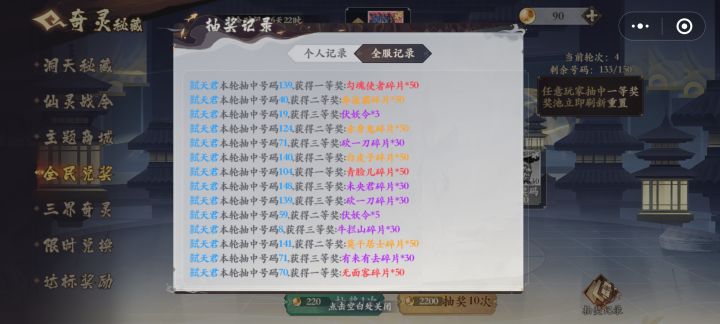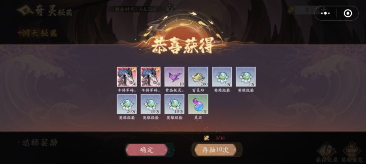 大家好,我是弑天君。。。直接开始吧。。 奇灵秘藏活动是获取百灵卷碎片的主要活动。 第一部分-洞天秘藏 100次必得妖灵和仙灵,用伏妖令进行抽奖,本部分一句话概括——一定要十连抽,单抽只有哭,请看图! 第二部分-仙灵战令 充值98可以获得一个仙灵、100个红碎片、100个橙碎片、50个伏妖令、2500个百灵砂、300个紫光灵粹和60小时灵石经验收益,性价比还不错,新区缺各色妖灵和百灵砂,老