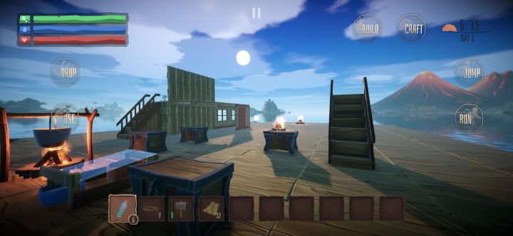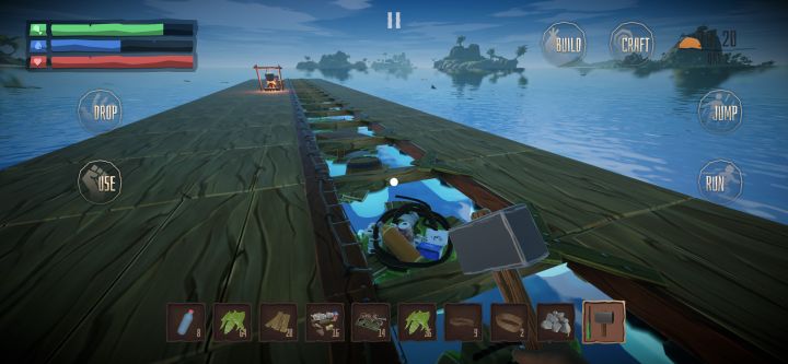①开局只有一个木板,可以先制作锤子视情况扩一到三个木板(按键太小而且有点不合理,容易掉海里)