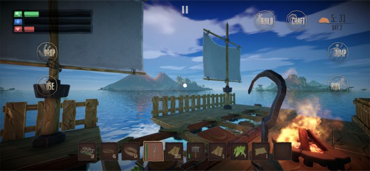 Start your adventure on a tiny raft, a piece of scrap metal, and some rope. Use these limited resources to craft your first raft and hook, and set sail into the vast, open ocean.