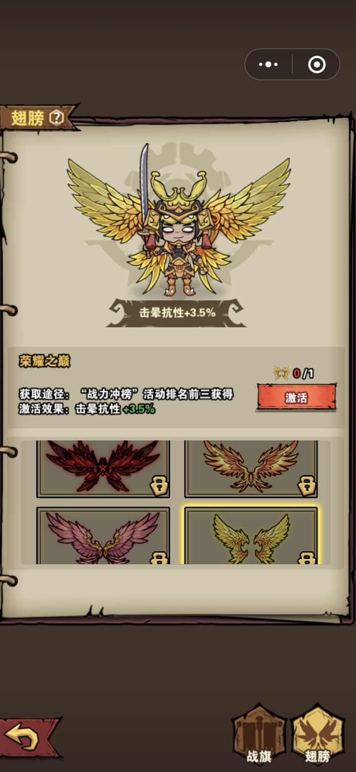 战旗说明:1.战旗是勇者战斗的重要助力,选择合适的战旗可以应对不同的战斗;2.翅膀会代替战旗外观,穿戴翅膀时将不显示战旗;3.翅膀具有特殊属性,激活翅膀后获得对应属性;4.参与活动获得对应翅膀;#单机游戏 #游戏日常