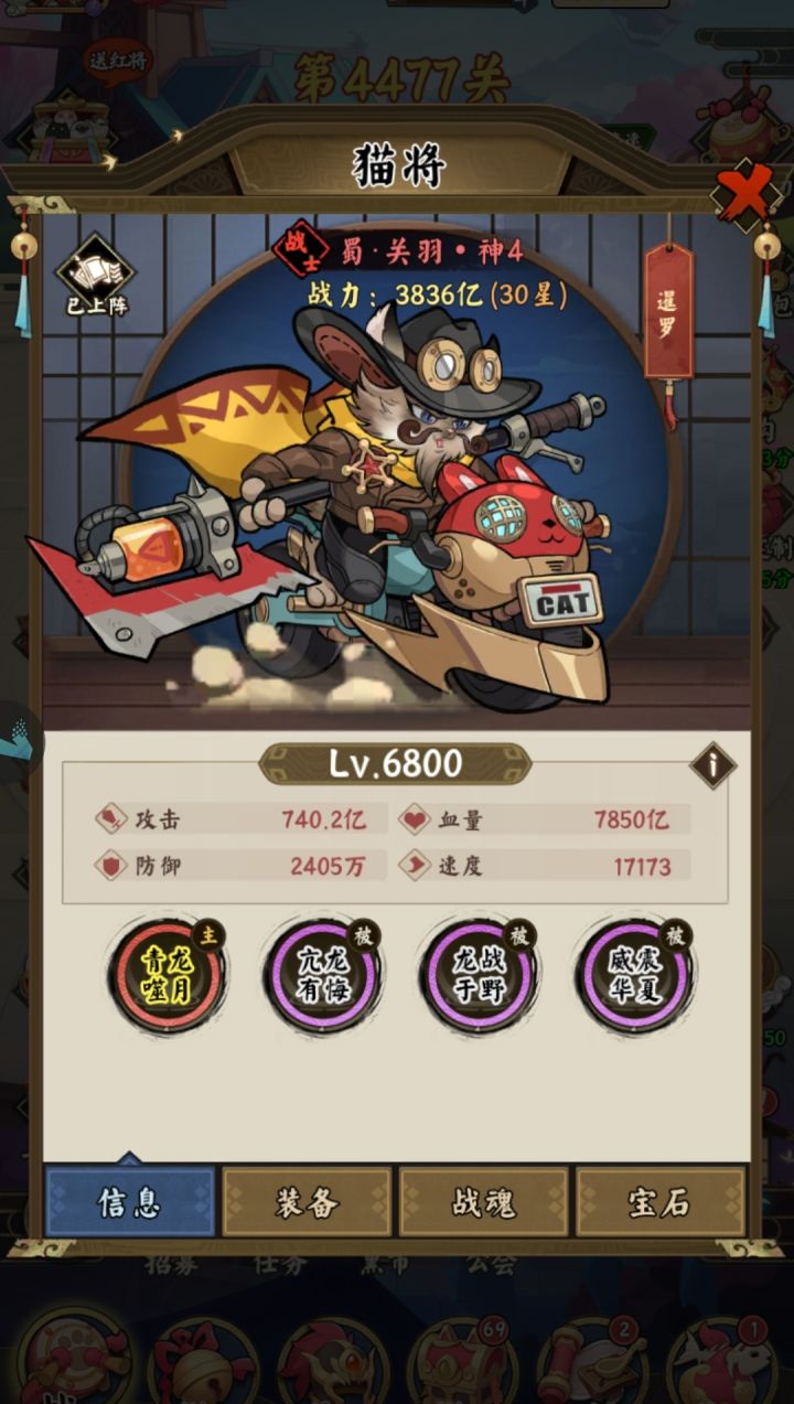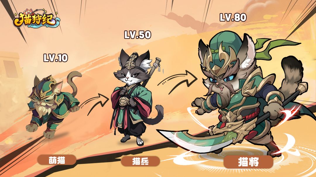全新三国萌猫放置卡牌《猫狩纪》正式上线!在这个游戏里你可以邂逅来自不同势力背景的猫将英雄,组建属于你的阵容征战四方,称霸三国,书写你的热血传奇!1.如何快速通过主线关卡 可以购买烤鱼增加战斗速度,快速通关主线。中期怪物能力提升后,需要对应提升猫将的能力才能保证快速通过主线关卡,提升猫将的等级、星级和装备可以快速提升猫将能力。2.如何提升战力 提升主公等级、猫将等级、装备、头衔等级和猫将星级
