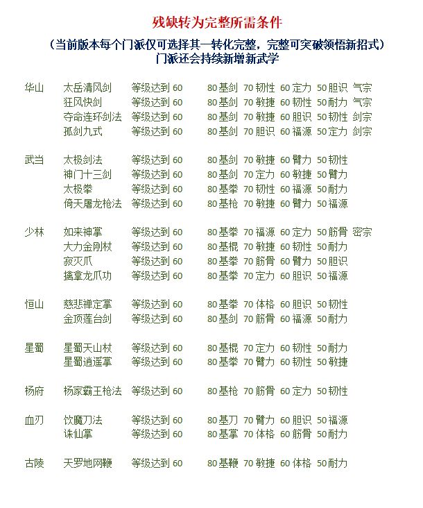 相信各位氪神都觉得自己门派武功太少,战力不够强劲。今天来写点来自“清风”大神实测。 氪金除了4阶内,真正的花法,就是换门派,每个门派1000元宝,全部都去一圈,学完1.2.3阶完整版,然后回自己想去的门派。各个门派(突破满)收益都是110精通。合计880精通。瞬间进入大佬行列。 上图有各门派1.2.3阶师傅好感道具。 每个门派需要学: 30级1阶,突破2次。 50级2阶,突破3次。(30师傅好感)