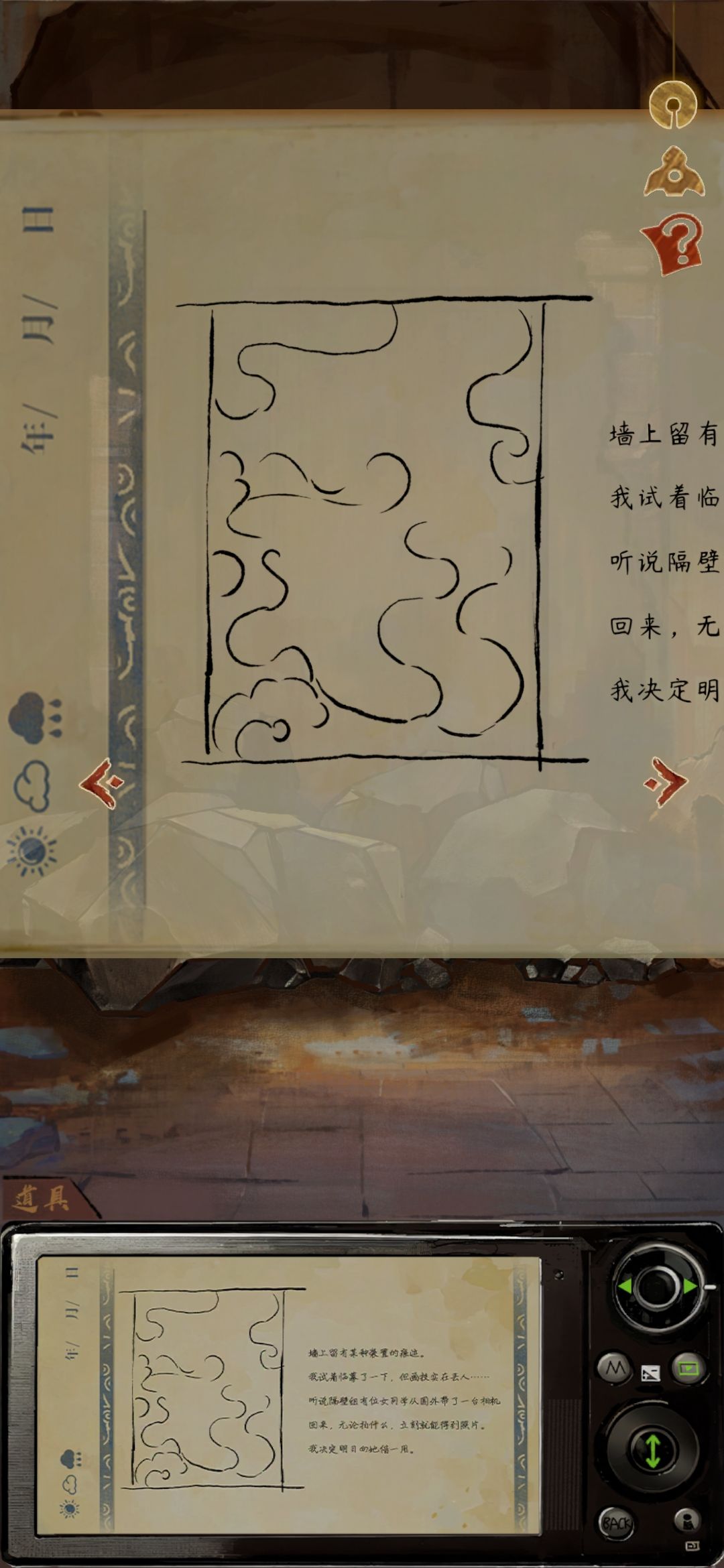 || | 第五章:结梦 先说一下cdd机的功能及用法 🔷①.点击cdd机照片可放置在场景中,再次点击可以取消 ②.cdd右侧按钮可实现照片上下翻转和选择下一张照片 ③.双指拉合可改变照片大小 ④.选择合适的照片大小到场景中可实现场景的改变 [祭坛] 1.在ccd中找到玉镜的图,放入场景中,并缩放到合适大小,实现场景复原 2.在ccd中找到带着迁瞳装置的图,放入场景中,并缩放到合适大小,实现场景复原