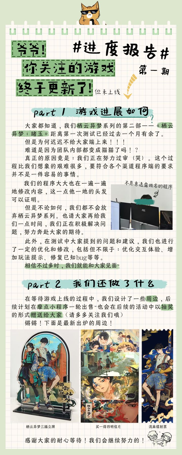 【part 1 游戏进展如何】大家都知道,我们栖云异梦系列的第二部——《栖云异梦:睹玉》距离第一次测试已经过去一个月有余了。但是为何迟迟不给大家端上来!!!难道是因为团队内部都变成猫猫了吗!?真正的原因竟是:我们正在努力过审(哭)。这个过程比我们想象的艰难很多,要符合各个渠道程序端的要求并不是一件容易的事情。我们的程序大大也在一遍一遍地修改内容,这一点他一地的头发可以证明。但是不论如何