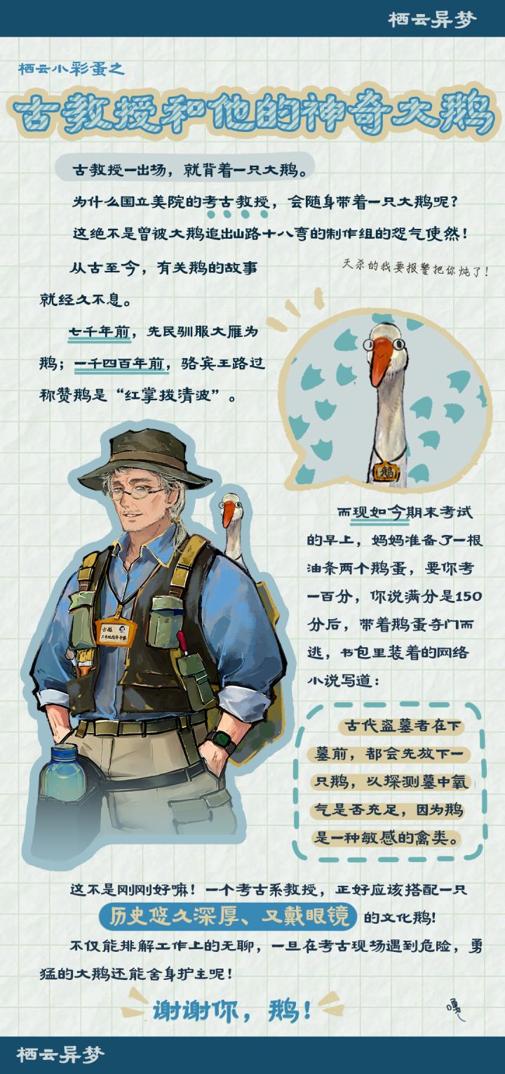 古教授一出场,就背着一只大鹅。为什么国立美院的教授,会随身带着一只大鹅呢?这绝不是曾被大鹅追出山路十八弯的制作组的怨气使然!从古至今,有关鹅的故事就经久不息。七千年前,先民驯服大雁为鹅,一千四百年前,骆宾王路过称赞鹅是“红掌拨清波”,而现如今期末考试的早上,妈妈煮了一根油条两个鹅蛋,要你考一百分,你带着鹅蛋夺门而逃,书包里装着的网络小说写道:古代盗墓者在下墓前,都会先放下一只鹅,以探测墓中