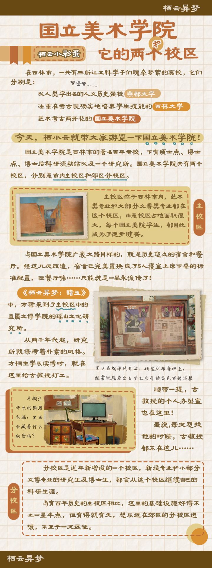 在西林市,一共有三所让文科学子们魂牵梦绕的高校,它们分别是:以人类学出名的人文历史强校燕都大学,注重在考古现场实地培养学生技能的西林大学,以及艺术考古两开花的国立美术学院。 今天,栖小云就带大家游览一下国立美术学院! 国立美术学院是西林市的著名百年老校,下有硕士点、博士点、博士后科研流动站以及一个研究所。国立美术学院共有两个校区,分别是市内主校区和郊区分校区。【主校区】 主校区位于西林市市