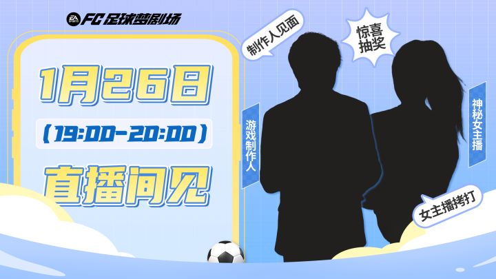 Boss们好呀!今天艾莉莎带来了一个好消息:我们很快又要见面啦~1月26日(下周一)19:00-20:00,策划直播将准时开启! 大家一直关心的研发进度、后续规划,这次都会和大家解答,当然还有阿迪达斯正品球衣、阿迪达斯迷你足球、京东卡等直播好礼也绝不缺席~而且听说这次还有“新朋友”亮相直播间噢! 直播时间1月26日(下周一)19:00-20:00 直播平台抖音、视频号【FC足球梦剧场