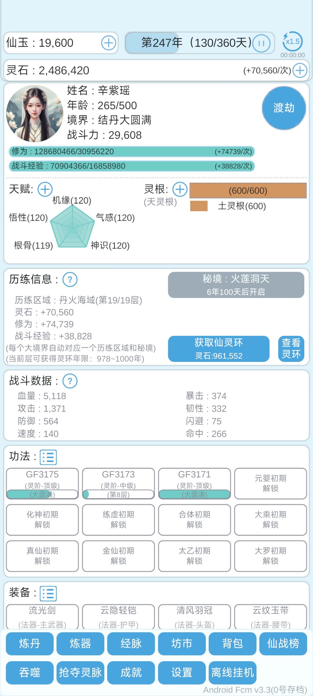 玩到了结丹 不急着渡劫一个大境界,停留在最后一个小境界把东西都搞好再渡劫下个大境界(后面得吃丹药提升成功率) 基本上主要等秘境,秘境打通4层可以扫荡 功法就喂高,顶(后面秘境一轮的时间比较长,估计等不到那么多高,顶功法喂养?自己估摸着来) 最重要的除了秘境的丹药功法 就是普通途径都能获取的灵石,好多地方都用到 历练层数,抢灵脉,扫坊市尽量先拉满 经脉我个人灵石>基础属性>修炼>功法 仙战打得过一