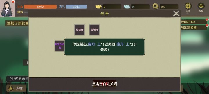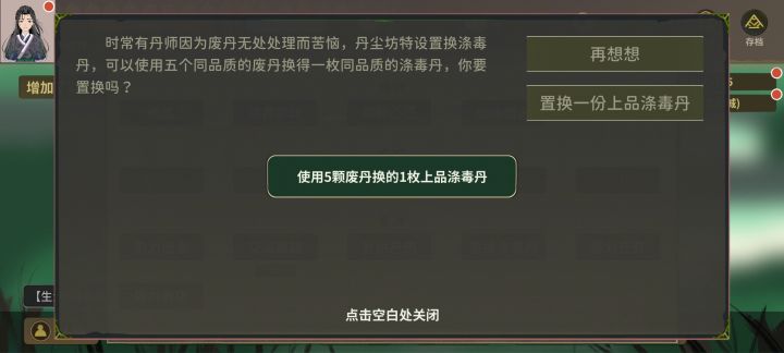 我的上一个档,一直有几百颗丹吃不完,开了一个新档试验出了bug。新版本炼丹换取的涤毒丹会莫名多出许多,如图,我开的新号只练了一炉,总共出25颗废丹,换取丹药之后,总数依然是25颗,这导致现版本的炼丹绝对是最强的流派,只需要一个人造火灵石,一个人造水灵石炼出废丹,换取涤毒丹,贩卖之后是十几倍的利润,前期来钱的速度甚至比家产万贯还要快。但家产万贯依旧是现版本必选的,开局就送一匹马,减少移动消耗30%