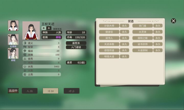 涉及属性的参考,涉及门派势力基本认识的参考一、天赋的类型与强度1.天赋的类型 游戏内天赋按选取规则分类,上方为种族/背景天赋,天赋唯一,例如人族-家财万贯,妖族-蜘蛛精-猛毒蛛等。下方的天赋为可选天赋,与种族天赋的点数相加不超过总点数即可。 但我们从实际需求出发,需要把天赋分为发育类和上限类(其实没有相关定义,方便理解提出的概念),部分天赋兼具相关特点。 发育类的天赋普遍能提升角色单位时