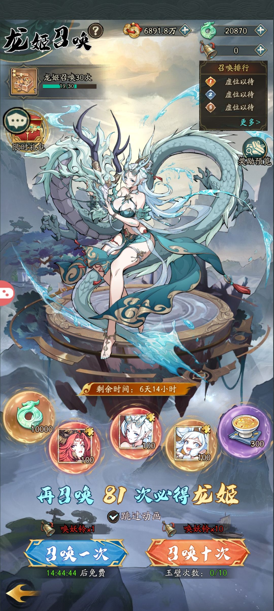 这个活动一开始这个界面不是这样吗,上次那个“睚眦赴阵”那个活动也是这样,开局一个100抽才出保底,我怎么看怎么拿不到保底,压根没怎么抽,最后两天经人提醒才发现,这个保底可以切换成青龙,80抽就能拿到! 零氪的大家注意一下这个活动!这次这个活动刚开,同样的是每日10*7+每日免费1*7+签到20抽,一共97抽,稳稳的能拿到青龙,青龙平时我们神兽招募和神兽弹珠都是拿不到的,想拿青龙的小伙伴们一定不要错