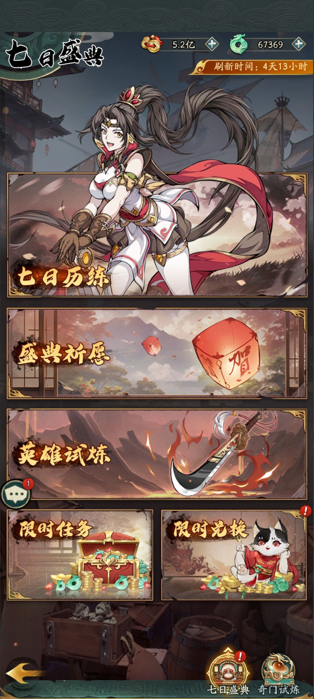 游戏里有两个轮换活动,这里是我们白嫖主要拿资源的地方。 1.七日历练 正常完成每天的任务就能把奖励拿满,除非队伍练度太低了,试炼b伤害没有。唯一要注意的是孙尚香这个七日历练。有两个不注意就会完成不了的任务,一个是快速作战,每天一定要买满,另一个就是问鼎中原,这个七日刚好卡在问鼎更新的时候,正常每天打五次是完成不了任务的,一定要花玉买次数,很便宜50一次。 然后是平时留神兽抽奖券和锦囊券。最少手里