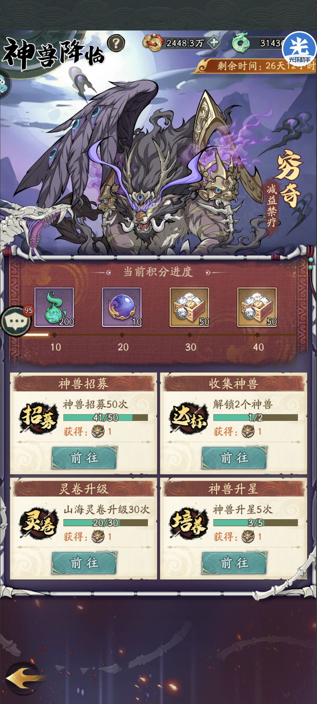 各位此时好,我是极致。 本期带来基础硬件中的【神兽】 文中涉及观点非绝对正确 仅供各位参考。 ⭐最新修改日期:2025年5月22日 目录: 1️⃣基础篇 2️⃣养成篇 3️⃣配置篇 4️⃣其他篇 正题开始。 ▶︎基础篇 【开启条件】 区开服第4天,等级49级开放 【来源渠道】 山海招募 锦囊弹珠 运营活动 新区前期,神兽升级主要靠玉璧购买神兽珠,冲刺阶段建议每天买满,开通神兽特权变成半价,有预算要