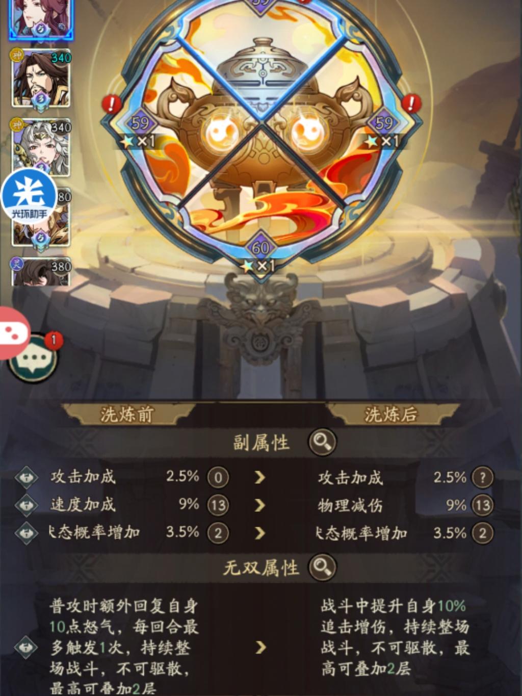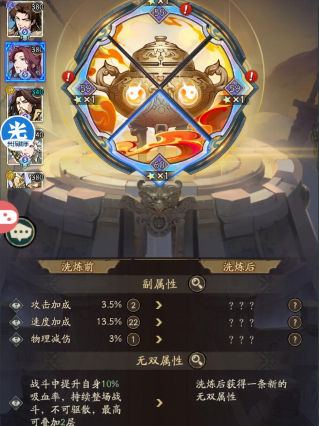 各位小将军,上古四大凶兽之首【饕餮】撕裂虚空,正式降临《群英风华录》!同步开启"凶兽助战"专属活动,登录即领千连抽、限定外观等超值福利!—— 饕餮降临·吞噬万界 ——▶ 无双技能:战斗开始时吞噬敌方全体属性,针对不同类型武将施加精准压制(降低攻击与生命上限),效果持续整场且不可驱散、不可抵消;战斗开始时或释放主动技能时,额外降低敌方全体行动速度与最终伤害加成(可叠加层数,上限3层),全面瓦