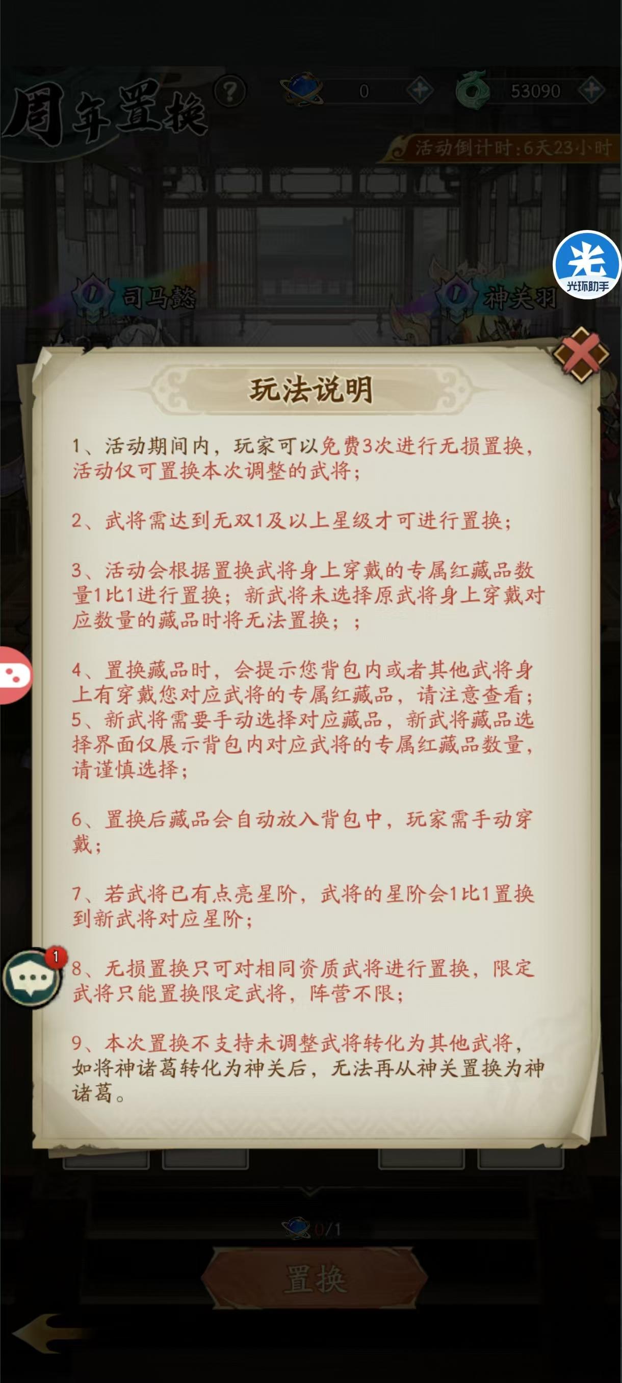 置换只考虑95和限定神魔,95本体最多的是马超,可以再合一个无双换张春华本体,那红装会不会也要跟着从满级马超那边强行置换?限定神魔目前能换到谁?神关羽、神诸葛、司马懿、祝融、马云禄都挺好,还是要看能换到谁,如果能换到目前活动限定王元姬、华雄、公孙瓒以至于灵将那几个,还是可以考虑卖一个神关羽后面再补。。。。。