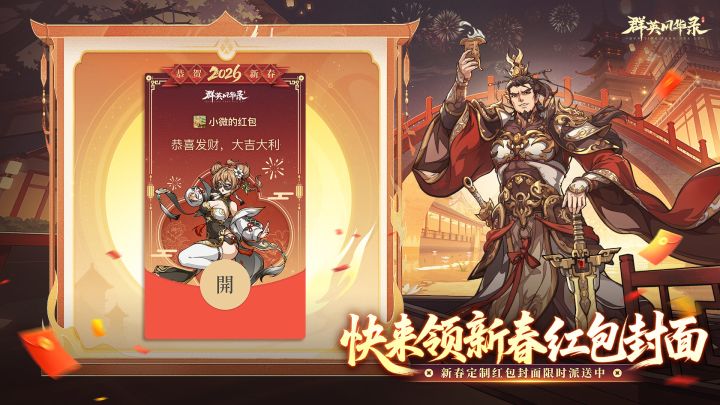 亲爱的小将军: 新春将至,为答谢诸位对《群英风华录》的深情守护,我们特别准备了定制红包封面送给大家~只要简单参加活动就能抽取啦~祝小将军们运气旺旺,抽到定制红包封面嗷!🎁 活动参与方式在本帖评论区留下您的新春祝福/想对我们说的话即可~❤活动时间2026/2/11-2026/2/15💌活动开奖2026年2月15日周日中午12点开奖,由系统抽选50位小将军送出定制红包封面~🌟 领