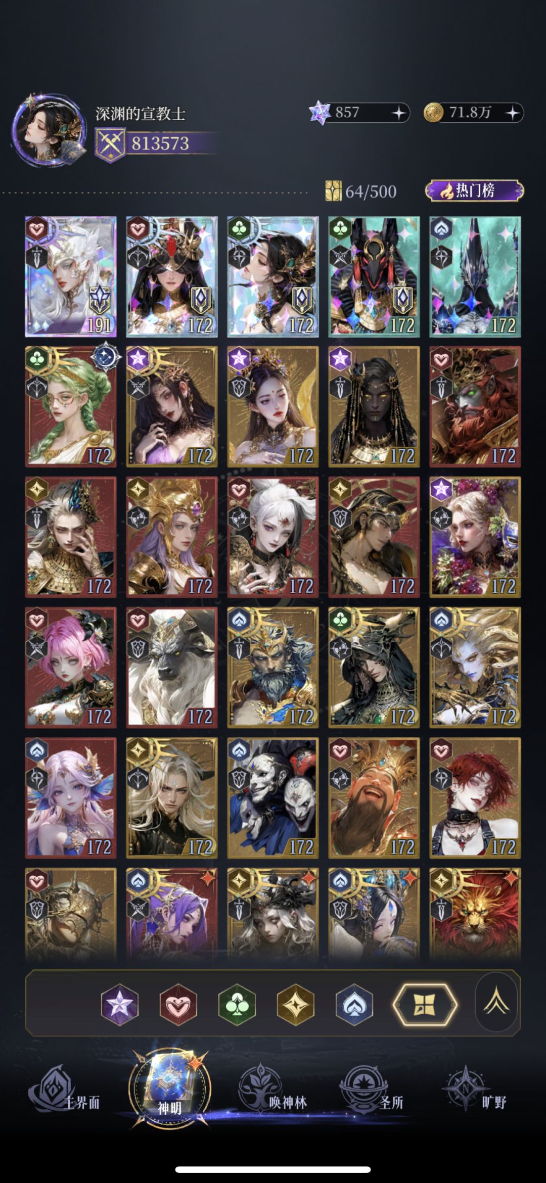 唤神林中有心愿单设置功能,将想要获得的神明卡牌放入其中可增加获取几率,今天来分享一下我的心愿单设置。 黑桃 首选波塞冬和赫卡忒,另外两个位置可按需挑选,波塞冬一定要养,不仅有先手群控技能,配置黑桃暴击流神龛的话也非常重要! 我计划在角斗场组个控制队,所以选了美杜莎哟~ 梅花 首选封夷和潘,另外两个位置可按需挑选。 如果想要组爆发收割AOE队,一定要把阿努比斯放上去,不推荐阿尔忒弥斯,其他刺客有更好