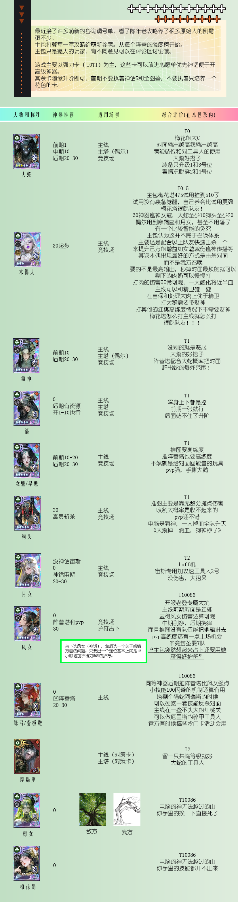 #游戏攻略 三编:添加了新梅花卡厄里斯的游玩体验,伤害可观,综合下来位于精卫上一些。先说优点:众所周知,精卫出场容易暴毙,打大肉容易卡点or超时,新卡解决了这两个问题。配队上不要因为有木偶就塞一个召唤系的名头,只是一个增伤手段罢了,出木偶最理想的方式是快配合瘟神狗头秒掉对面后排最恶心的输出,只要对面死一个而你的女魃还活着,就好打很多了,滚雪球一样的增益buff,女魃减伤,瘟神负面buff传播