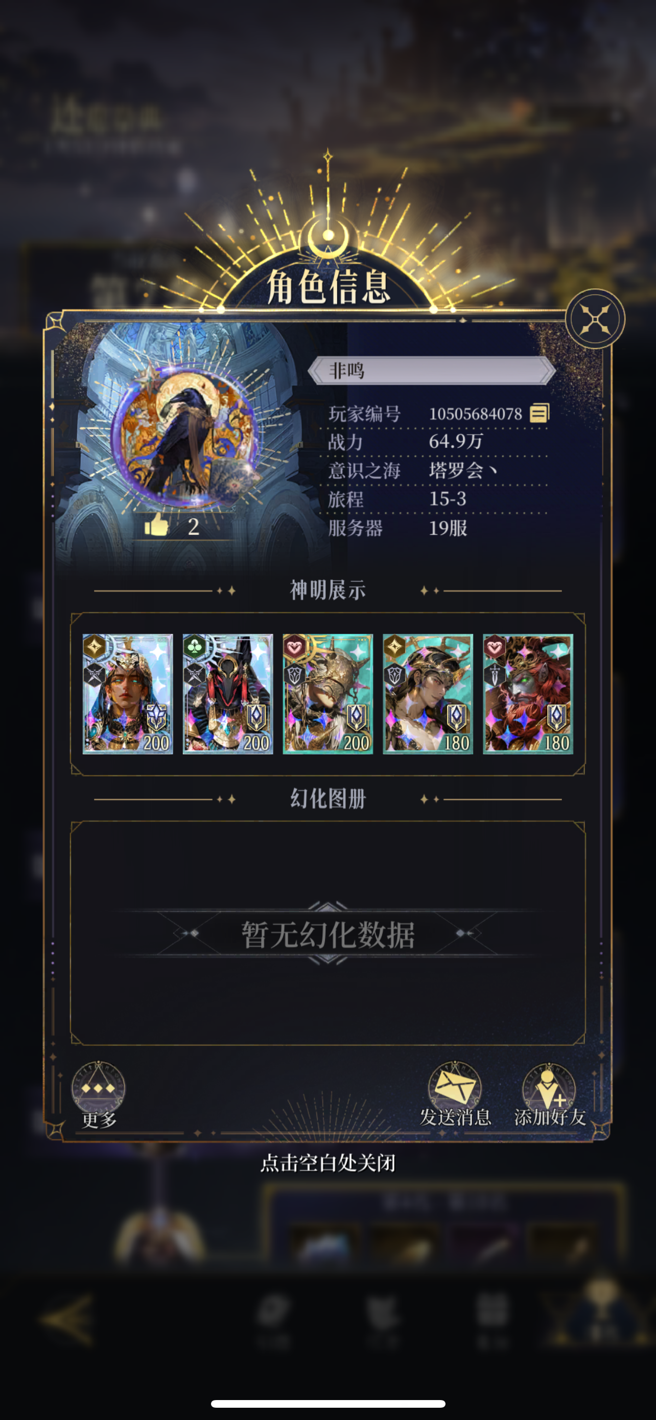 有人质疑,你是不是刷了,你是不是很肝,你是不是在人少区吃了资源。我刷没刷目前也只有8个神5,金色图腾才2个三级,钻石少的可怜。而且我在苹果3区,所有的排名活动都捞不到好名次,高阶角斗场进不了前8。宙斯哪吒也借不到,唯一借了大佬一次哪吒过500层,半天没还,大佬私我让我还,我没看到,结果把我好友删了,从那以后我都不借宙斯和哪吒了。所以通关57章真没想象中的难。搭配好过图很快的,下面言归正传。我只以