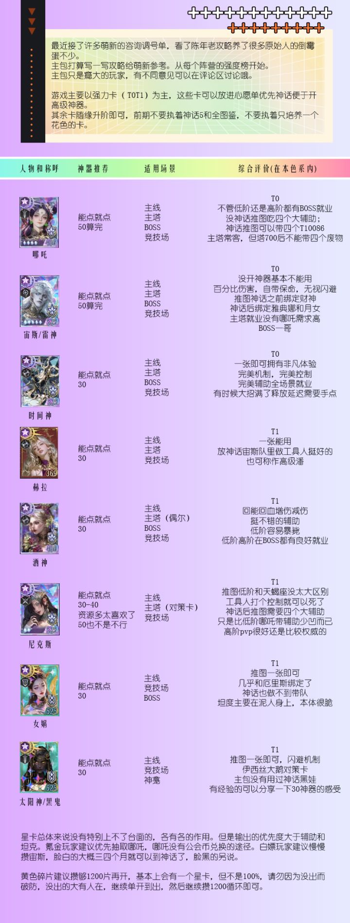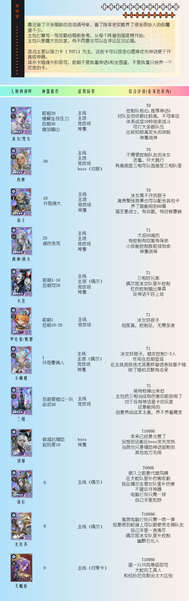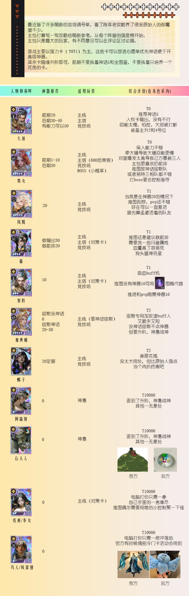 不朽箴言推图角色排行榜更新至2026.2.22注:仅限于推图,pvp不作参考哈常规推图阵容汇总根据本人前60章的推图经验,汇总了6套常规的推图阵容,欢迎交流指正天鹅女武神队大力神队三相刮痧队冰女控制队唯一真神哪吒队国家队