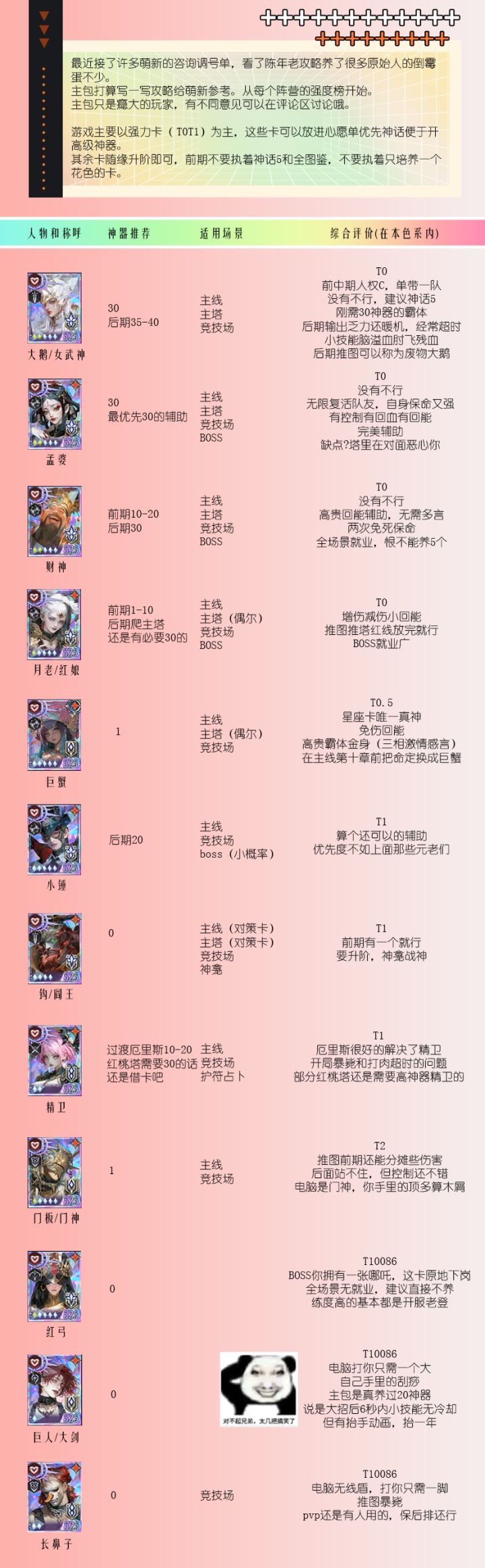 添加了努特和赫拉主包最近在推1000层之后的塔,感受为电脑人机数值逆天,把把跨10倍战力,管你什么样的哪吒,不好好养辅助的通通坐牢,辅助差的多更是坐大牢。所以一定要好好规划辅助的神器,红药水不要浪费,但是该拉就拉,尤其点名舞神,月老。绿药水目前只适合给大输出。装备觉醒,不要搞得雨露均沾,什么全员一觉,坐牢的时候直接当事人很后悔。