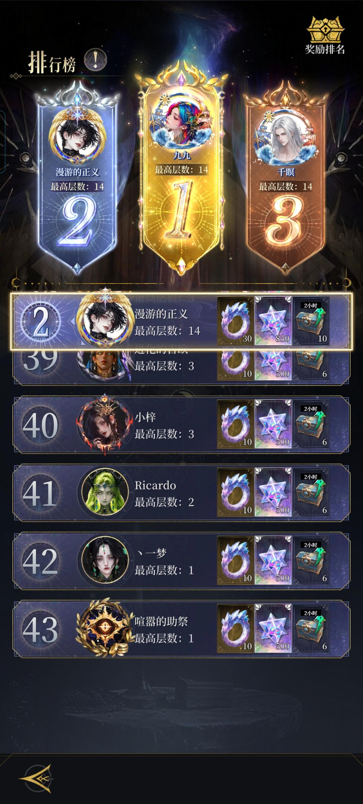 1-12层:3号位双子(橙或者橙+)13层:3号位双子(红+)14层:看图二,1号位狗头(20神器)+输出+奶妈,取消自动释放技能,最后2秒的时候关倍数,等对面双子放大后手动放狗头大招触发秒杀不要命定双子!不要命定双子!不要命定双子!看策划改不改吧,早睡的人吃大亏