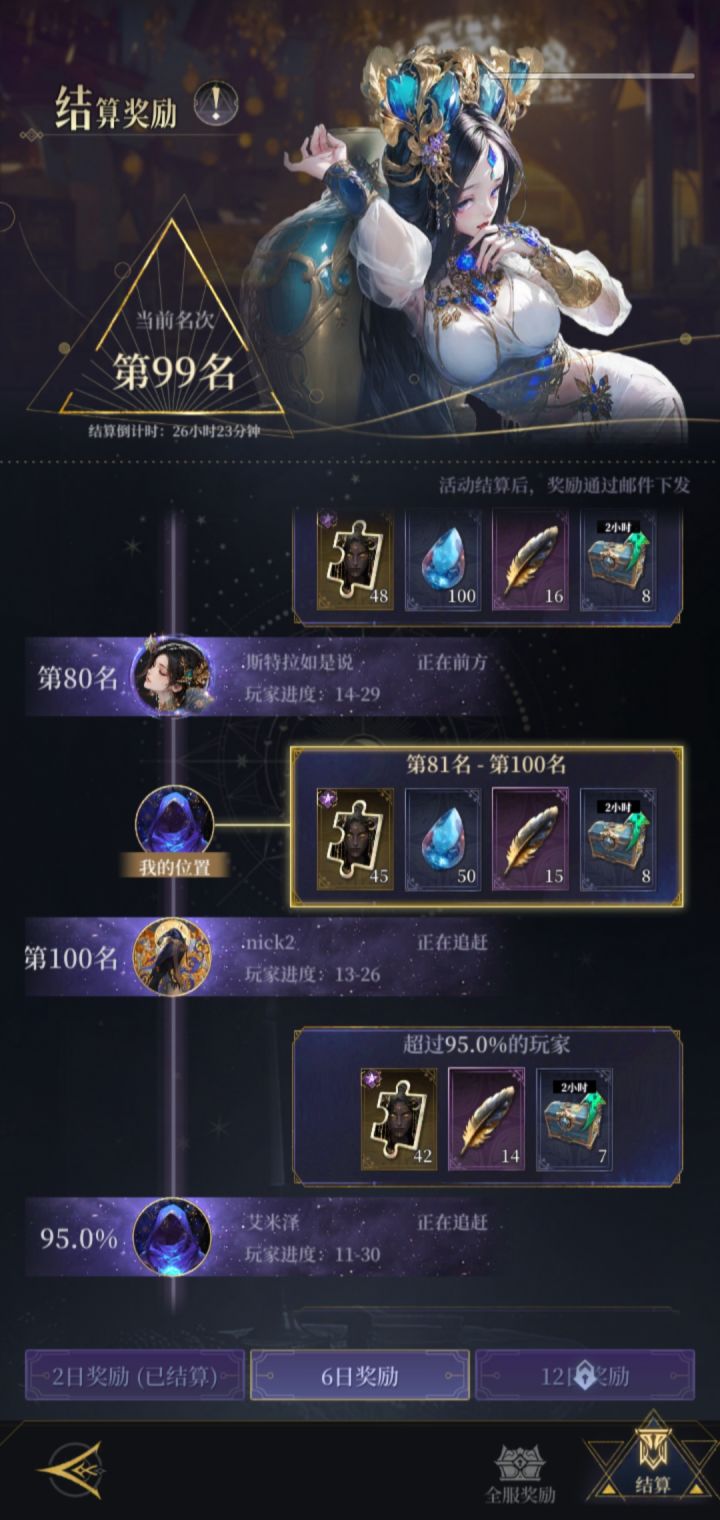 因为昨天就把这周唯一的助战用在10-30,导致今天卡在13-27,,,感觉这个助战就该留到每周最后一天用,用早了,越想血亏不过今天游戏体验比昨天好不少,毕竟昨天一套阵容挂机就行,今天因为全是越级打,不思考就收菜,反而有了点趣味性,,,进度方面勉强进前百,不过明天就应该会掉下来了,资源用的差不多了,明天开始就是收菜为主了(12章是真的简单,过了十一章直接到13-27)阵容方面已经开始尝试改了首