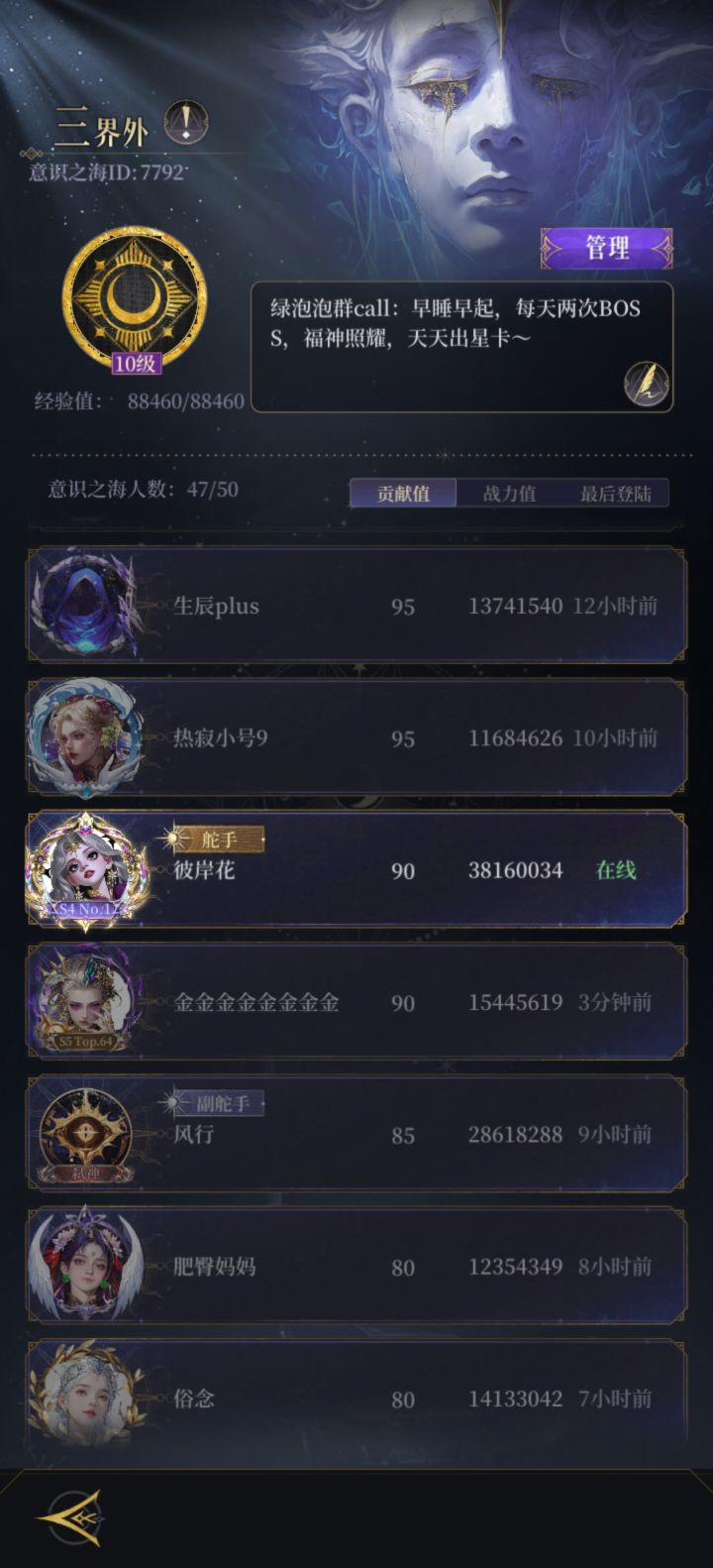 工会ID7792.航海基本上是第一,每天砍价都能砍到负100左右,战力无要求,活跃就行 ,基本稳定每天开2次BOSS,全神话星卡群里叫一声就有人借,反正现在也没办法刷沙盘了,不如就来这吧 还差最后几个位置,先到先得