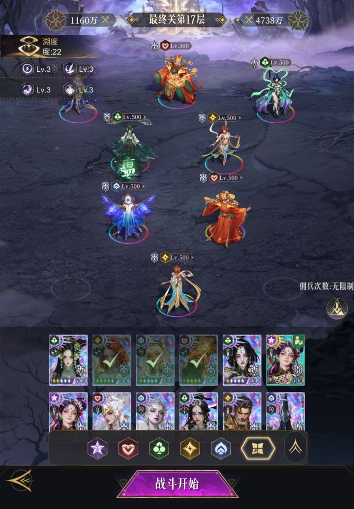 -心愿(不是很欧或者大氪很容易卡等级)建议每个花色主养一只♠️黑桃 1努特 2冰女 3波寒冬 4摩摩丝,不卡等级的情况下3,4换雨神和甲虫♦️方片 1大力神 2舞女 3赛特 4蝎子,同上小锤出了把蝎子换掉♣️梅花 1玄女 2狗头 3大蛇 4潘前期一张即可换温神,玩偶,女魁(随意了都很一般)♥️红桃 1大鹅 2孟婆 3财神 4月老,4可换伊登-配队 (序号也对应站位)15章前 1 大力神